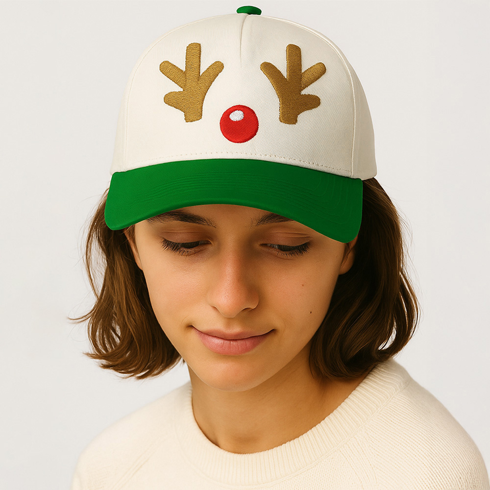 • Festive trucker hat featuring playful embroidered reindeer antlers and a bright nose design. A fun holiday accessory perfect for Christmas parties, family gatherings, and winter outings. Bring cheerful holiday vibes to your look with this cozy and spirited cap.
