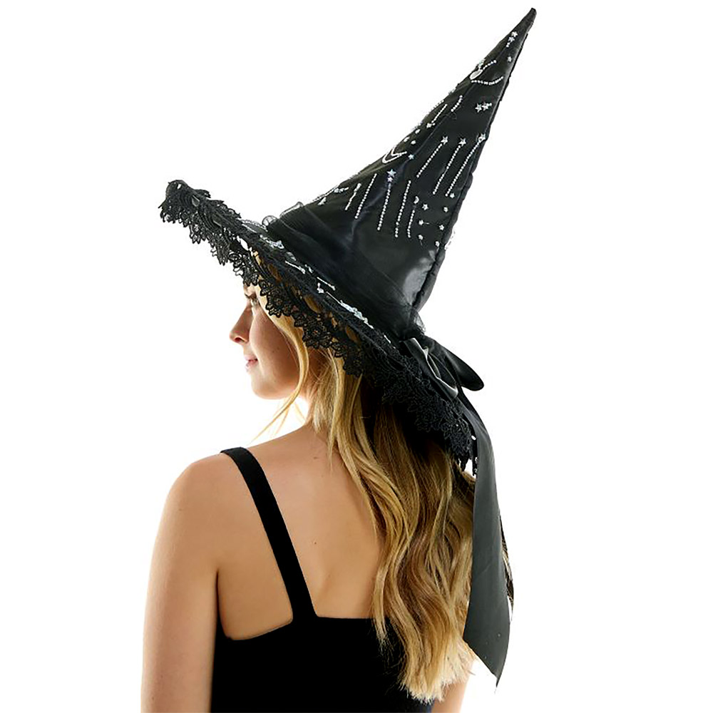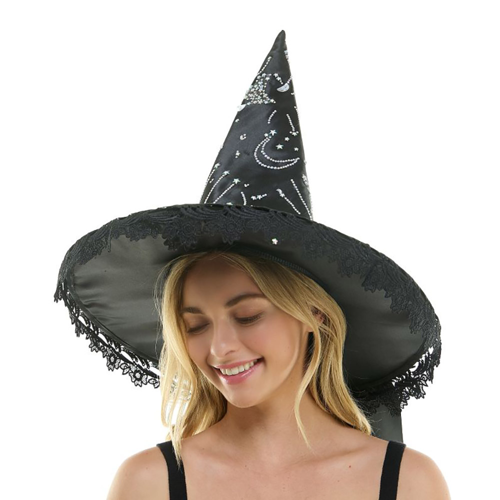 Rhinestone Studded Crescent Star Lace Trim Halloween Witch Hat