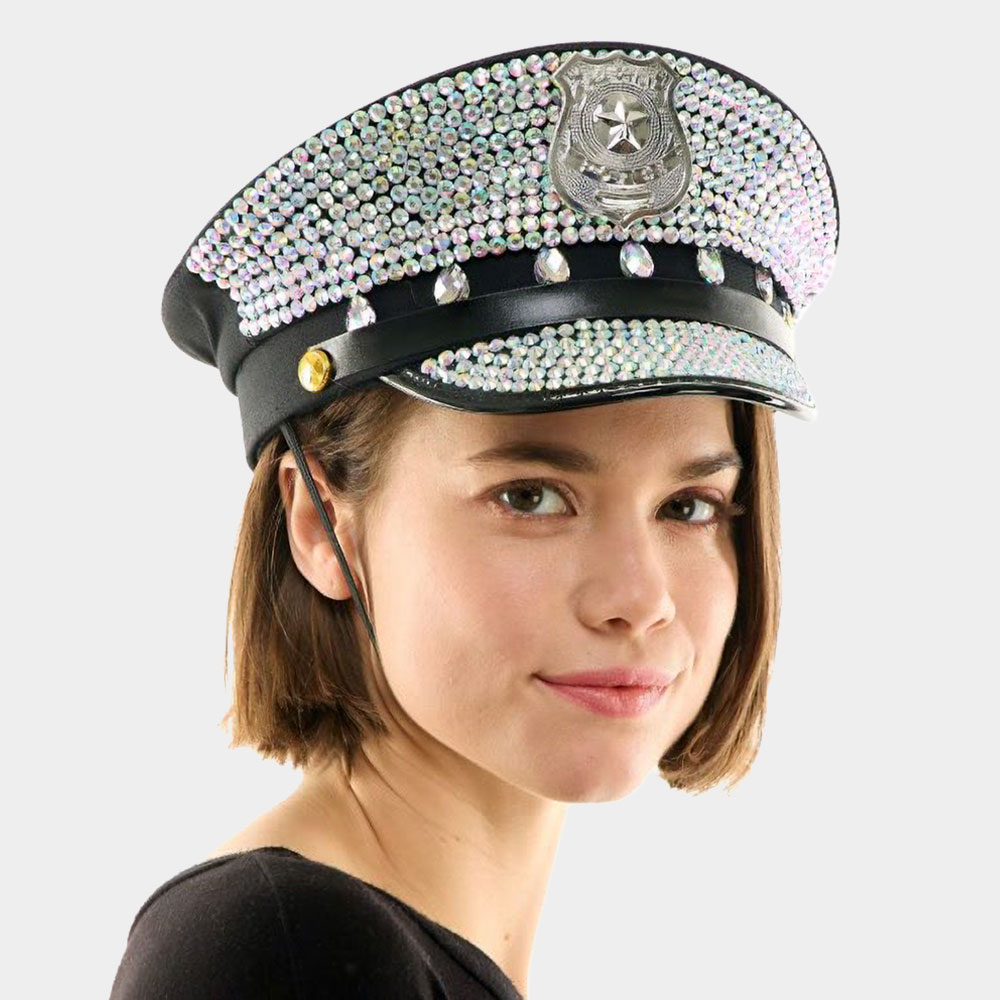• Eye-catching police-style hat adorned with shimmering rhinestones and a badge. Perfect for themed events, dance costumes, parades, or bold party wear.