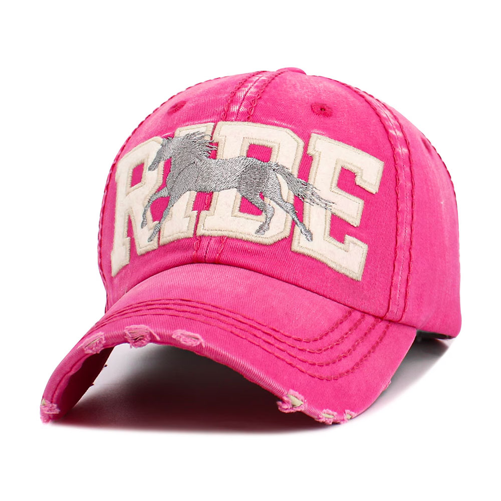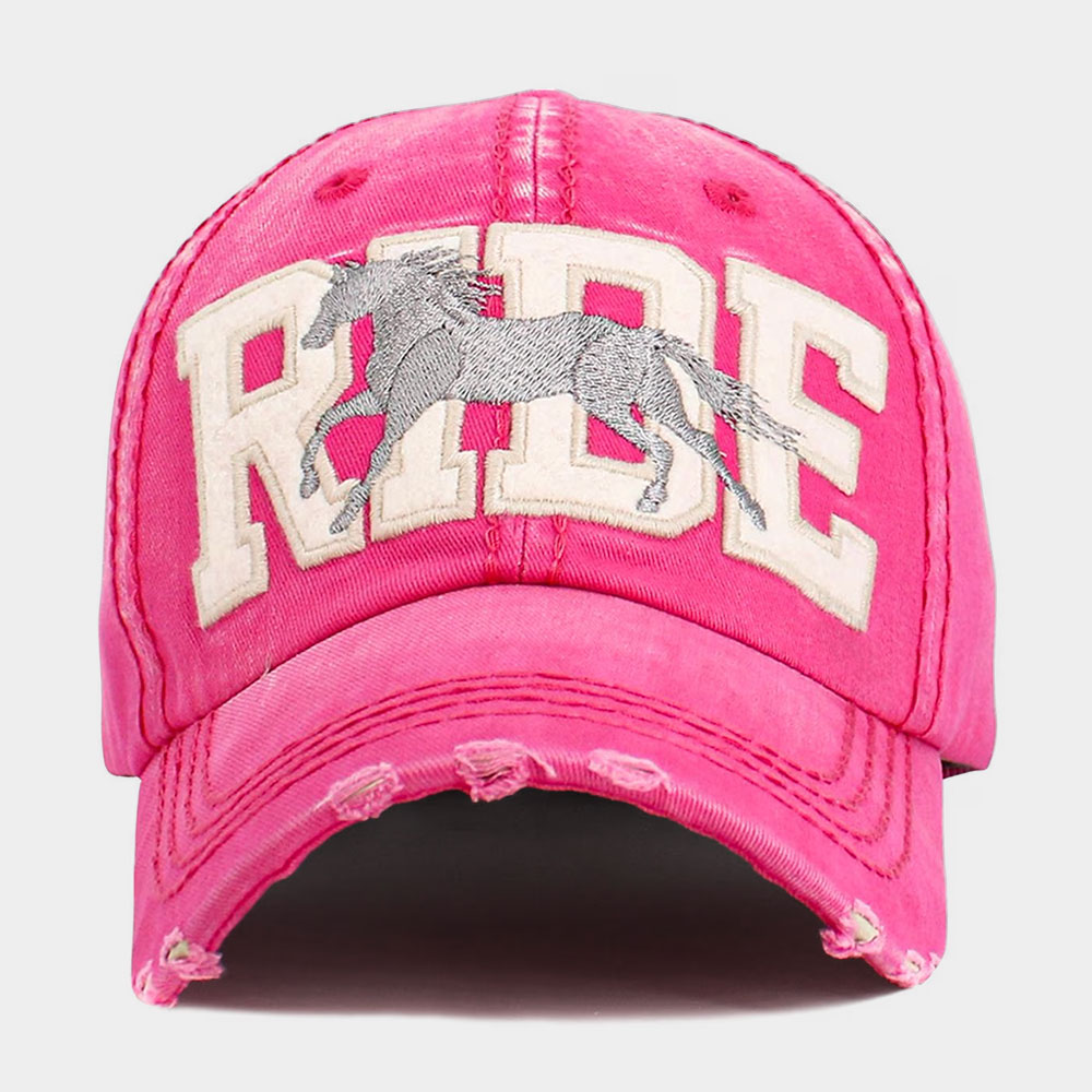 • Vintage-style distressed cap featuring embroidered "RIDE" text with a galloping horse. Perfect for equestrian lovers. Adjustable fit and breathable cotton for all-day comfort.