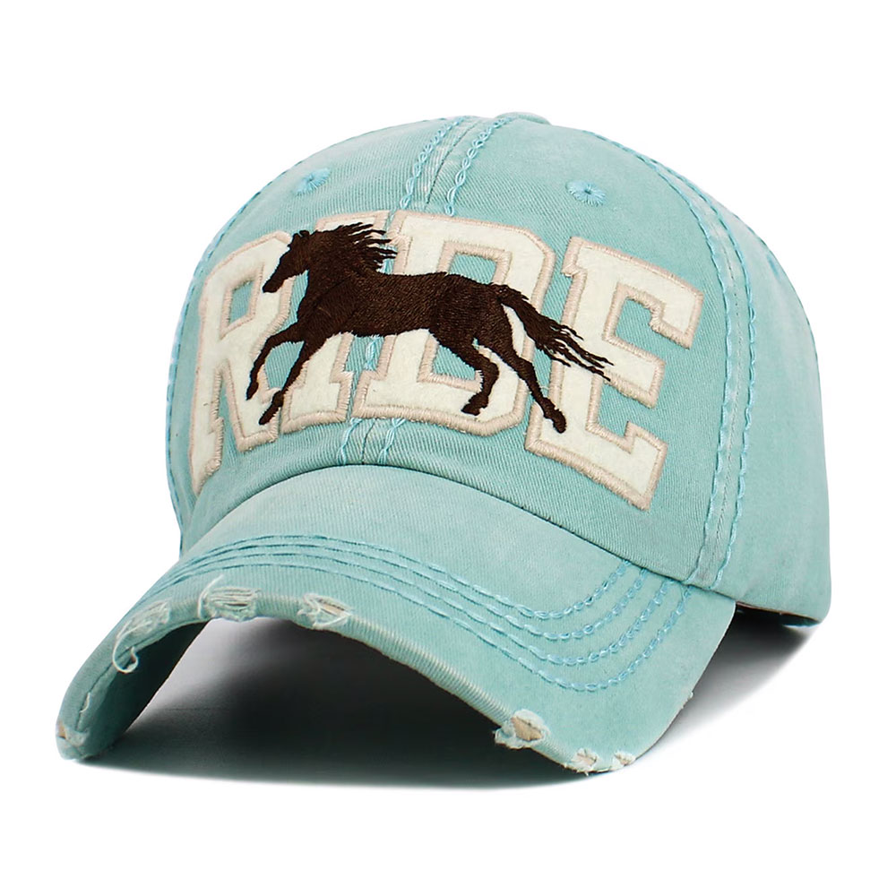 • Vintage-style distressed cap featuring embroidered "RIDE" text with a galloping horse. Perfect for equestrian lovers. Adjustable fit and breathable cotton for all-day comfort.