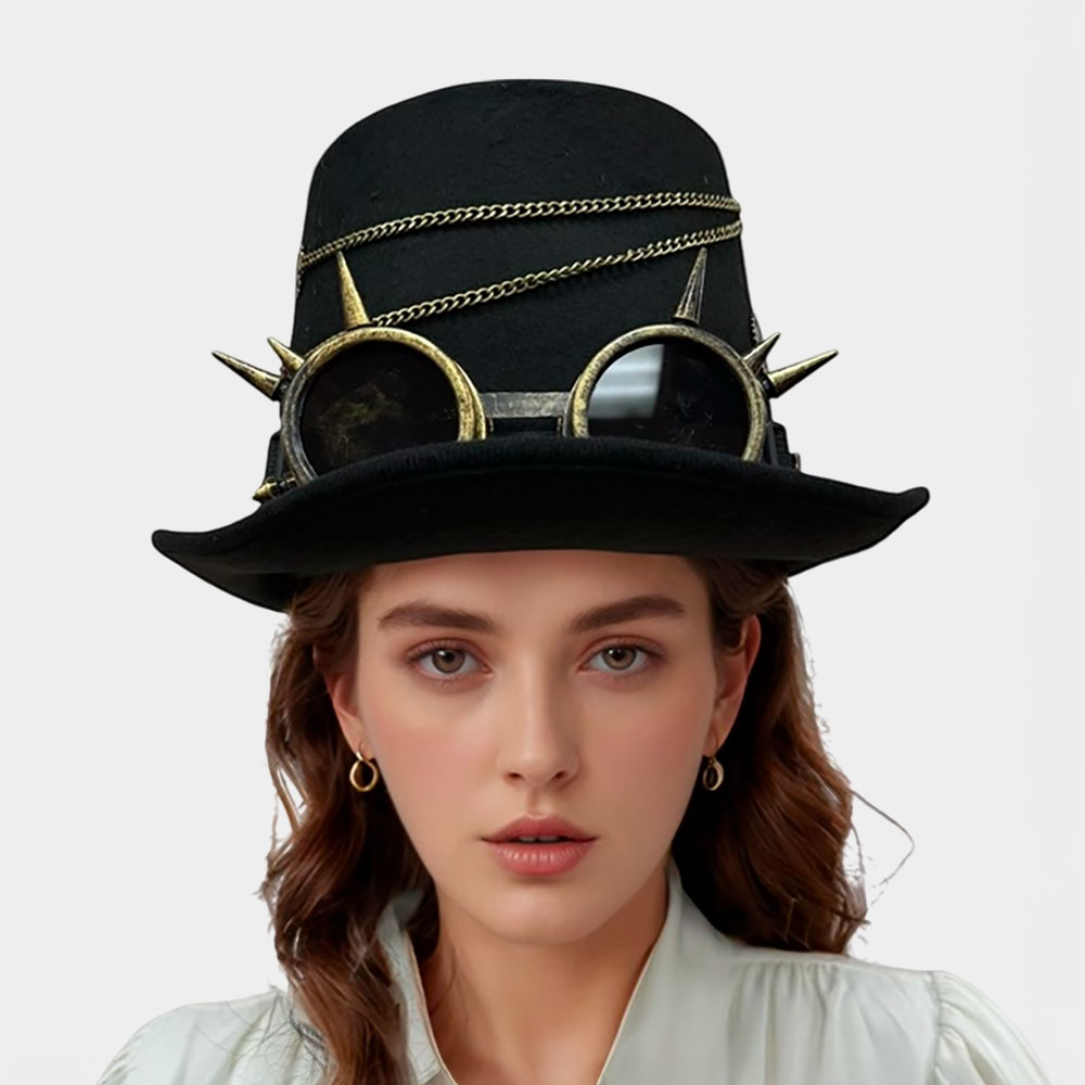 Details • Crown Circumference: 23" • Crown Height : 5.5" • Brim Width : 2" • Unique steampunk top hat adorned with chains, bold spikes, and classic goggles. Ideal for cosplay, themed events, or statement fashion with an industrial and retro-futuristic twist.