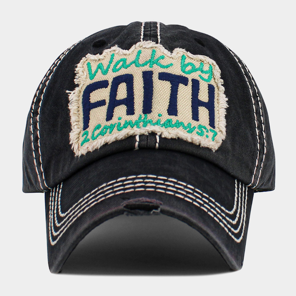 • Christian baseball cap featuring a bold "Walk by Faith" patch with 2 Corinthians 5:7 verse. Made with distressed detailing and contrast stitching, this adjustable cap is a stylish reminder of faith and strength for daily wear.