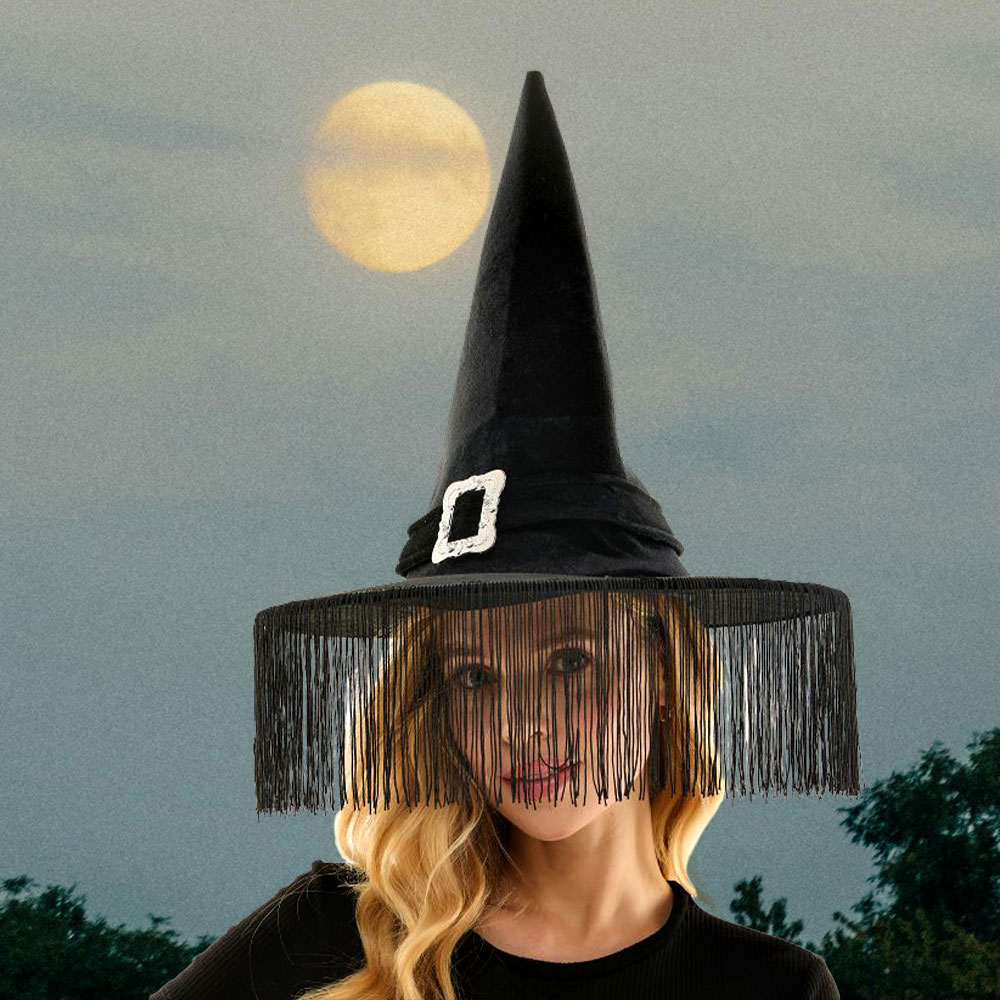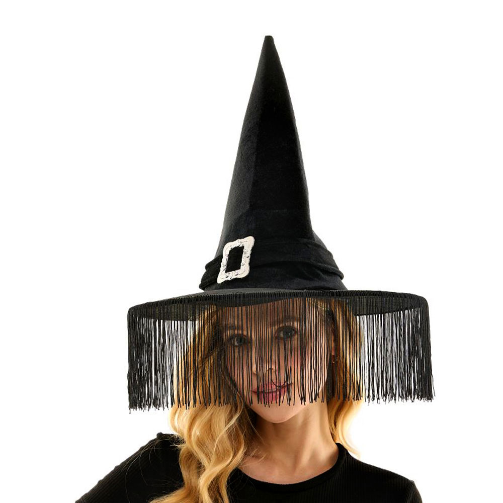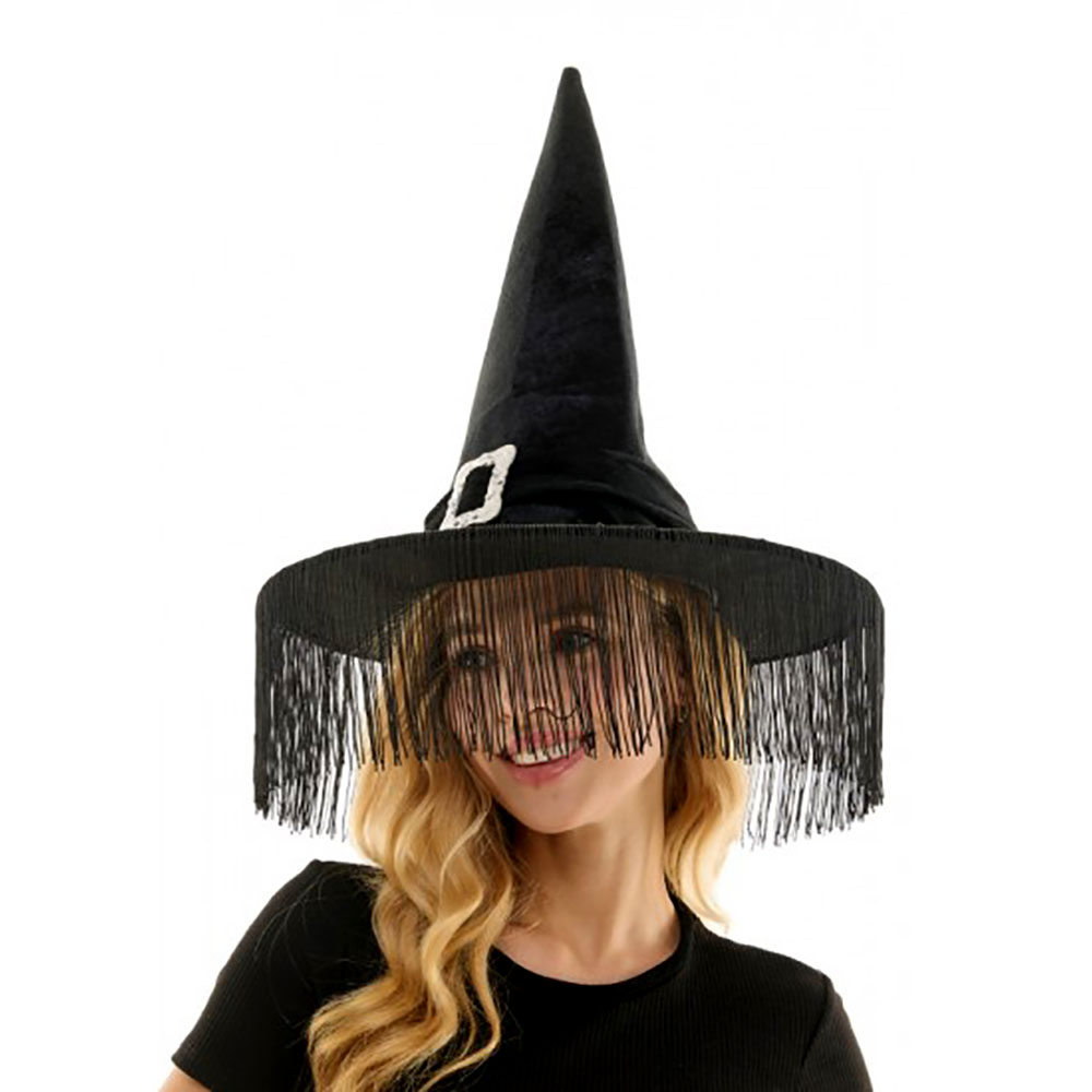 Details • Size : One Size • Complete your witch look with this tall pointed hat featuring a decorative buckle and dramatic fringe veil. A perfect accessory for Halloween parties or theatrical events.