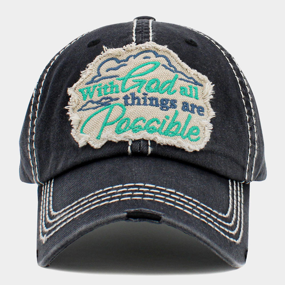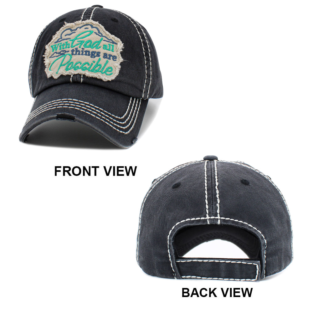 Details • Crown Circumference : 23" (Adjustable) • Crown Height : 4.25" • Brim Height : 2.75" • Material : 100% Cotton • Stay inspired with this meaningful baseball cap featuring a distressed embroidered patch with the message “With God all things are Possible.” Designed for casual comfort and faith-filled expression, this cap is a stylish reminder of encouragement for everyday wear.