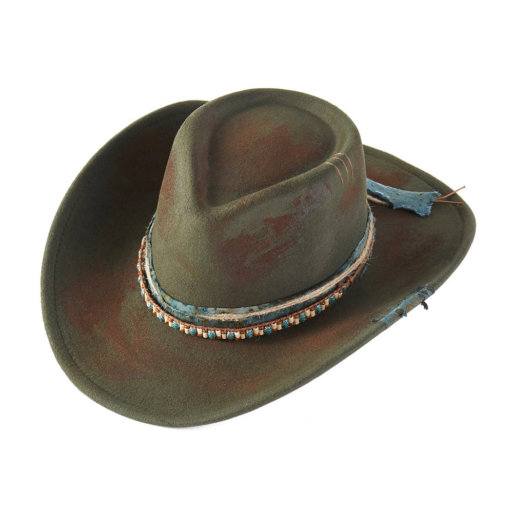 Details • Crown Circumference : 23" • Crown Height : 4.5" • Brim Height : 3.75" • Material : 100% Polyester • Add rustic charm to your look with the Vintage Western Hat featuring a handcrafted beaded band. Its distressed finish and timeless shape make it perfect for festivals, outdoor adventures, or casual wear, offering both standout style and all-day comfort with western flair.