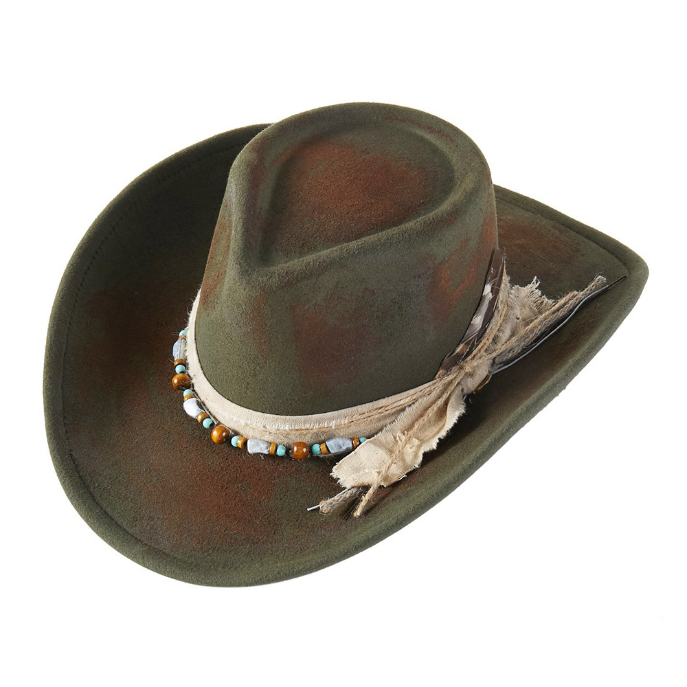 Details • Crown Circumference : 23" • Crown Height : 4.5" • Brim Height : 3.75" • Material : 100% Polyester • Add rugged charm to your look with the Distressed Western Hat featuring a beaded band and feather accent. Its vintage-inspired design and weathered finish create authentic western appeal, making it the perfect statement piece for festivals, travel, or casual outdoor wear.