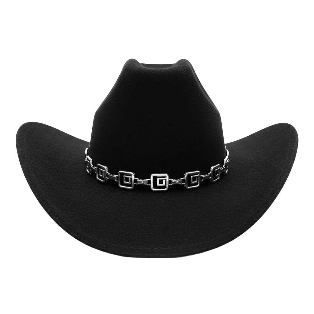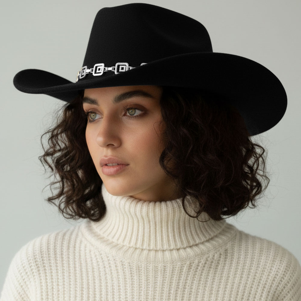 Details • Crown Circumference: 23" • Crown Height : 4.75" • Brim Width : 3.25" • Material : 100% Polyester • Make a refined statement with this Western-inspired hat featuring a bold curved brim and a geometric chain detail that adds modern edge. Designed to complement both elevated and casual looks, it offers a distinctive silhouette that brings effortless sophistication to any wardrobe.