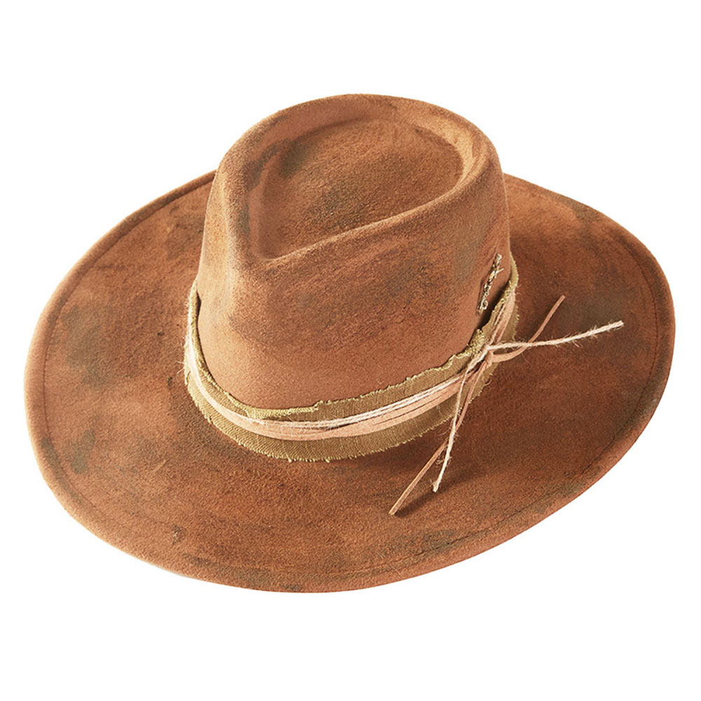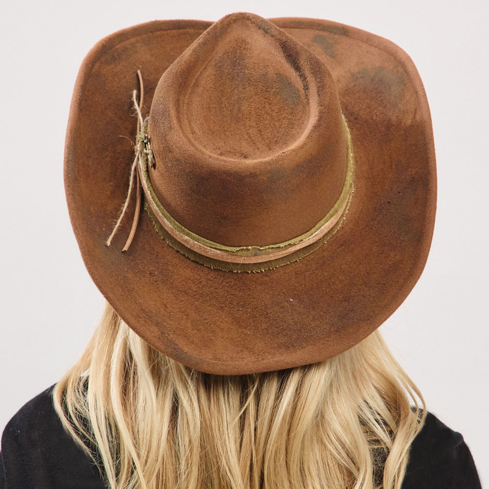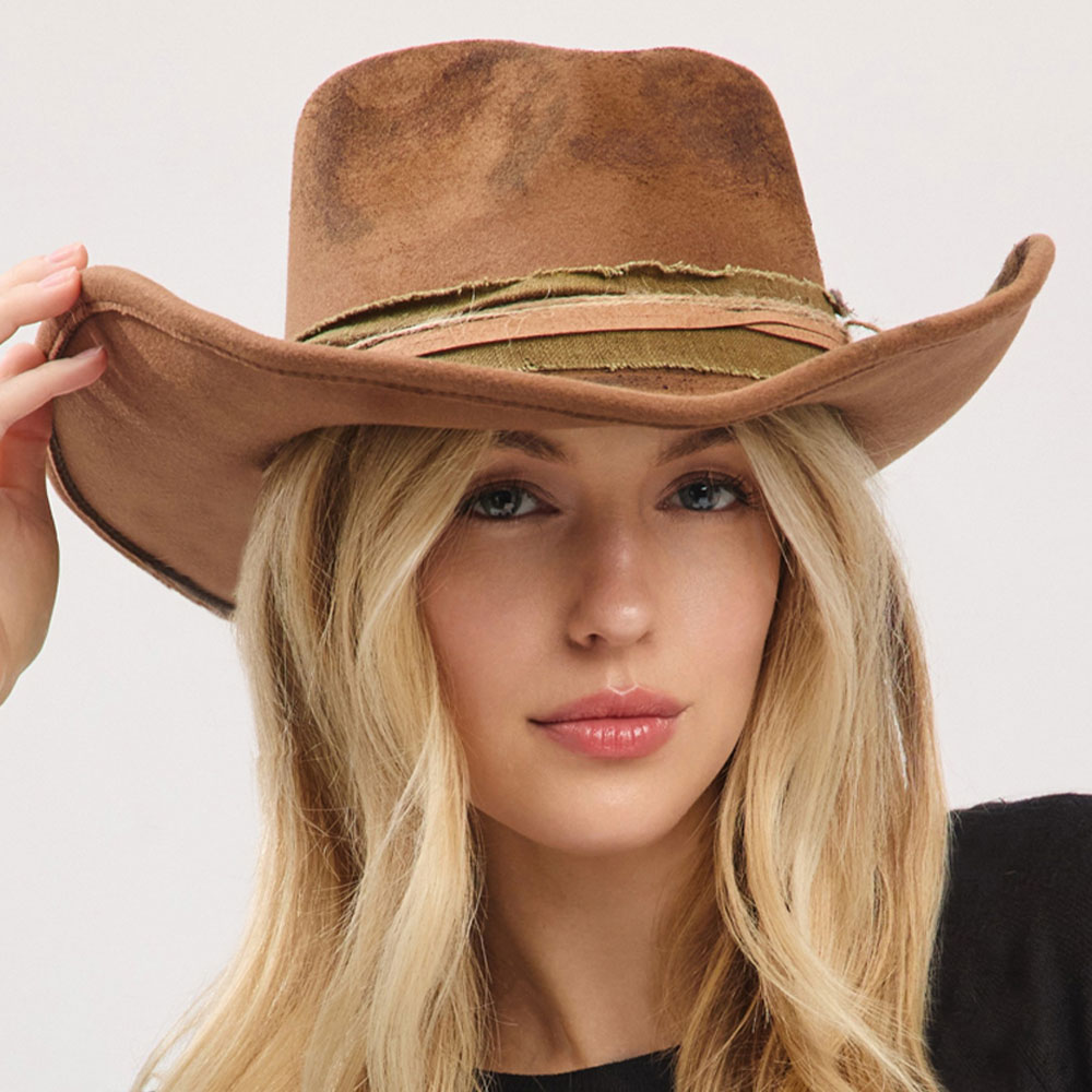 • Classic western hat featuring a weathered finish and layered fabric-twine band. A rugged accessory for rustic outfits, festivals, or adding vintage charm to everyday wear.