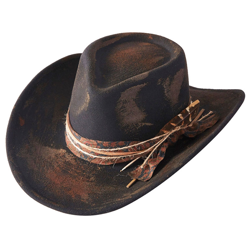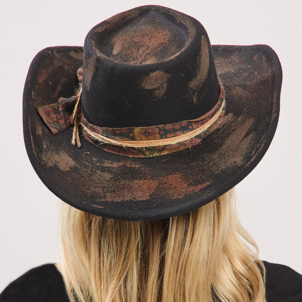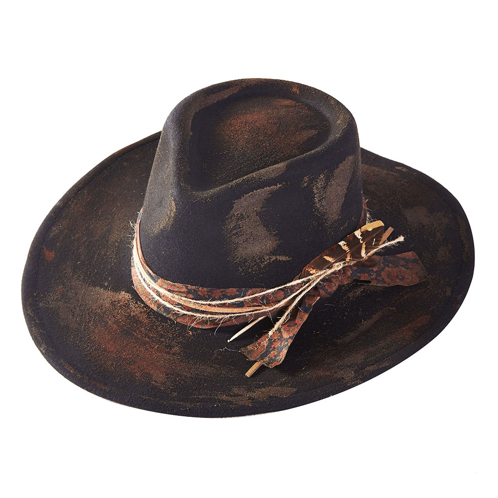 Details • Size : One Size • Material : 100% Polyester • Rustic western hat featuring a distressed finish, printed band, and feather accent. Ideal for festivals, rodeos, or daily wear. Lightweight design with adjustable comfort fit.