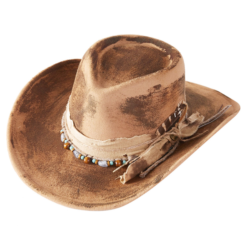• Western-inspired distressed hat with a frayed band, beaded details, and rustic bow. Perfect for themed events, casual outfits, or adding a rugged flair. Comfortable one-size design.