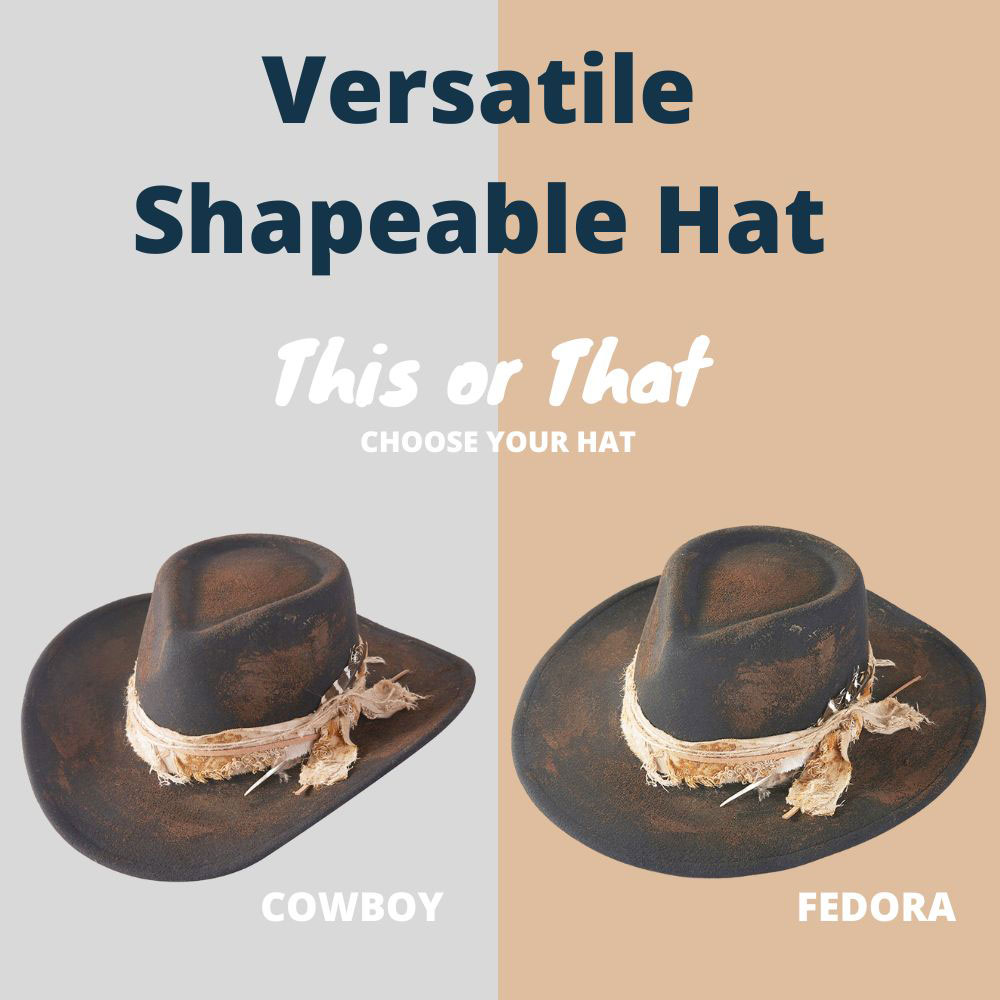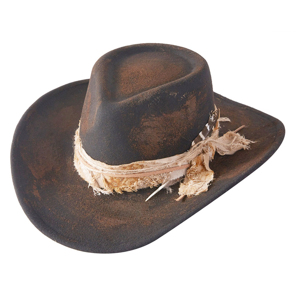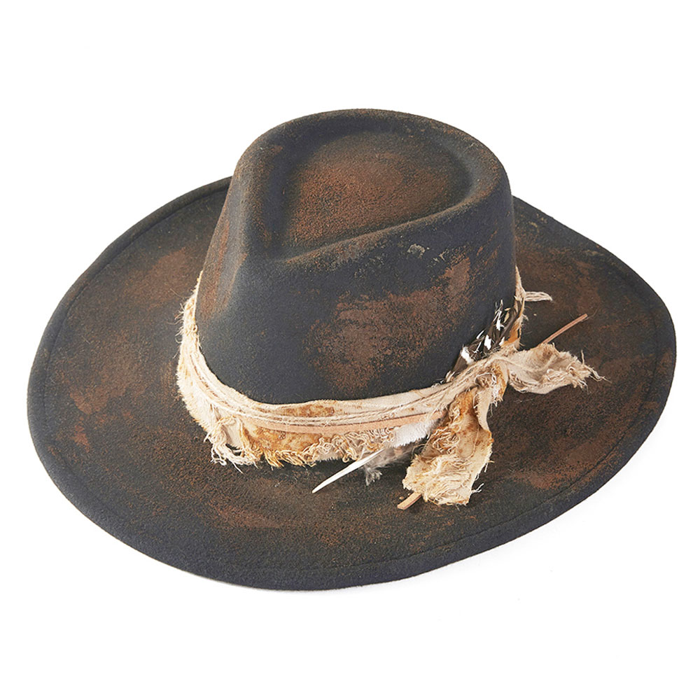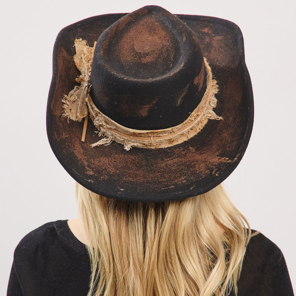 • Unique western hat with a weathered finish and layered fringe band. Perfect for rustic style lovers and themed events seeking an authentic, rugged fashion statement.
