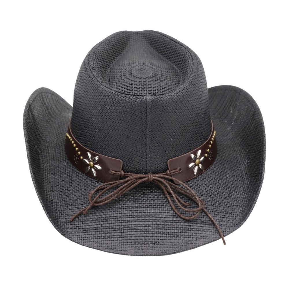 • Classic western cowboy hat designed with a structured crown, shaped brim, and decorative studded band featuring a bold emblem accent. Ideal for western fashion, rodeo outfits, festivals, and boutique collections, delivering a timeless cowboy silhouette with rugged character and eye-catching detail.