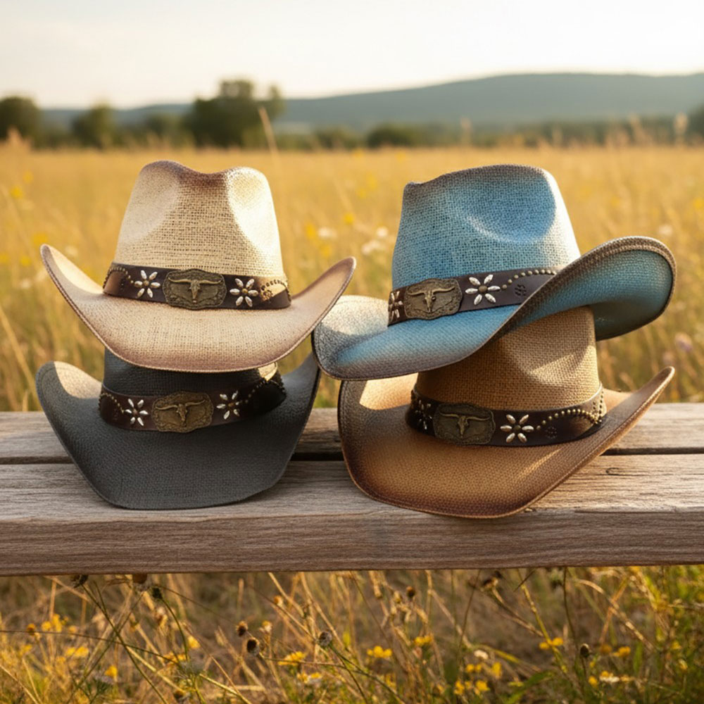 • Classic western cowboy hat designed with a structured crown, shaped brim, and decorative studded band featuring a bold emblem accent. Ideal for western fashion, rodeo outfits, festivals, and boutique collections, delivering a timeless cowboy silhouette with rugged character and eye-catching detail.