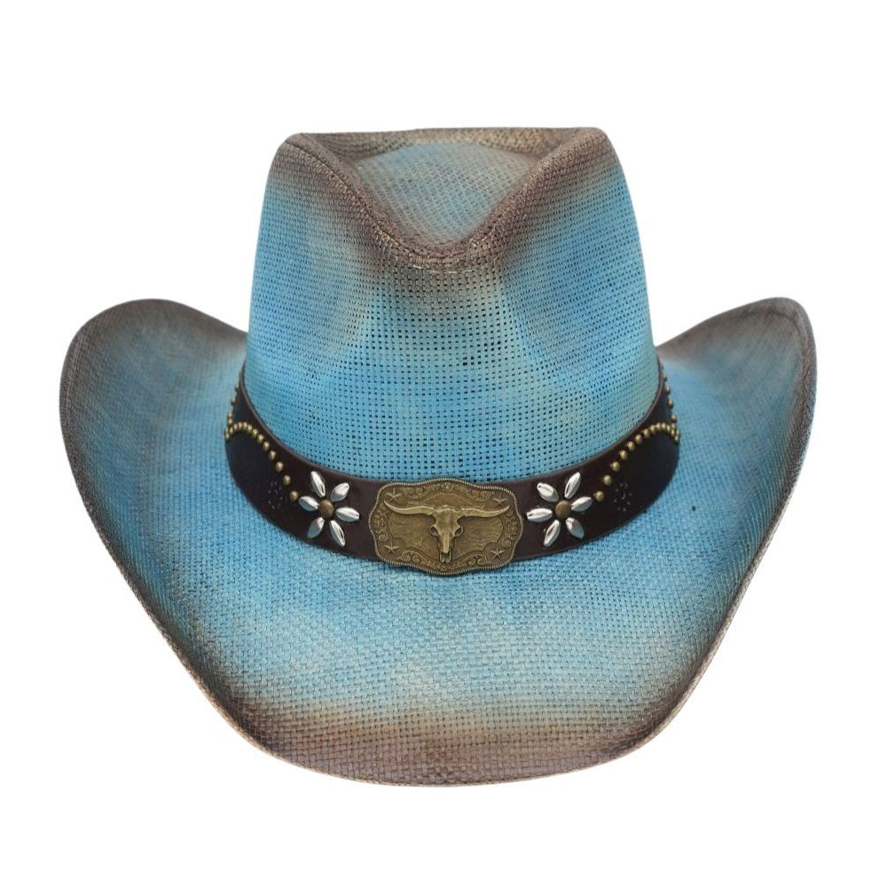 Vintage Metal Steer Head Buckle Accent Floral Studded Band Distressed Straw Western Cowboy Hat