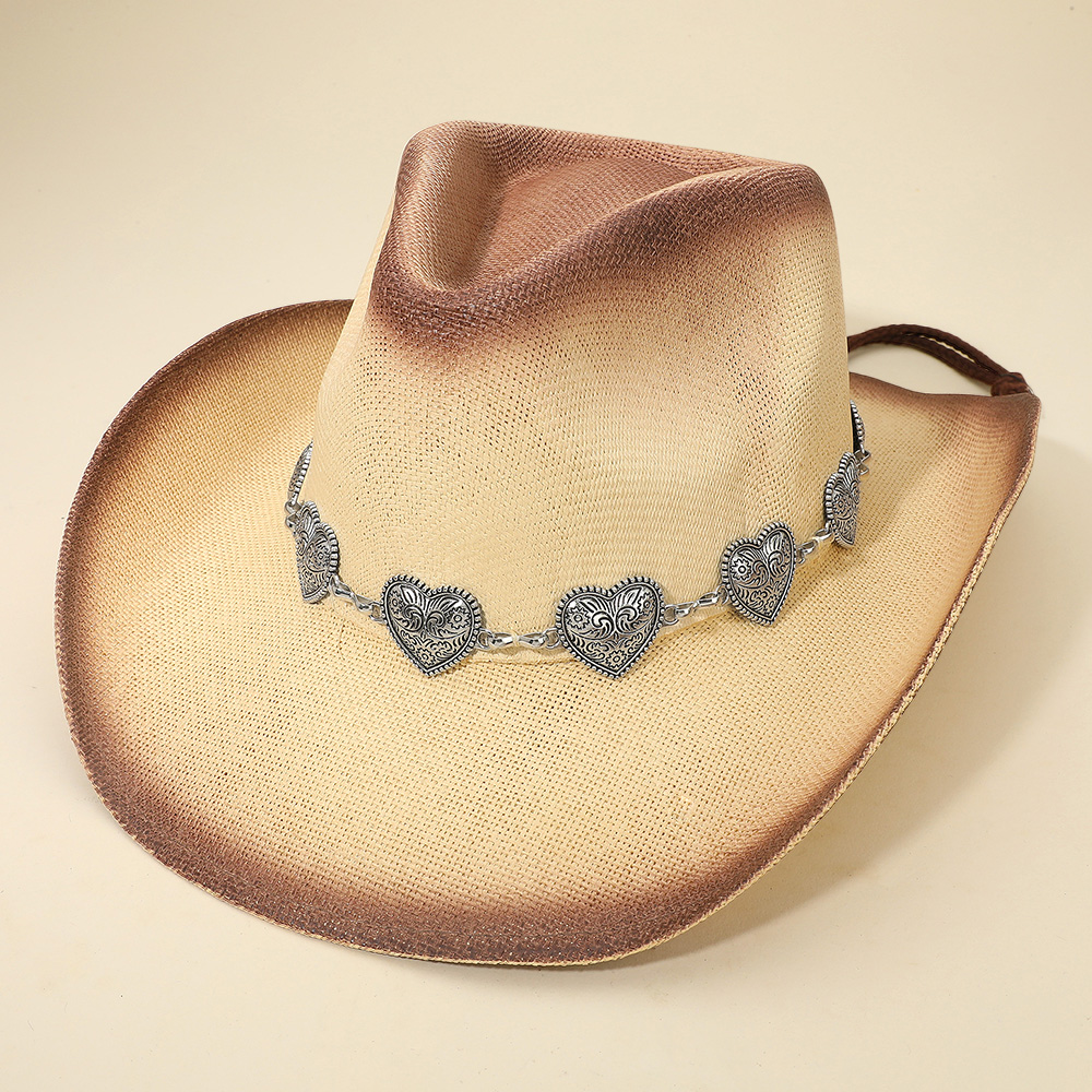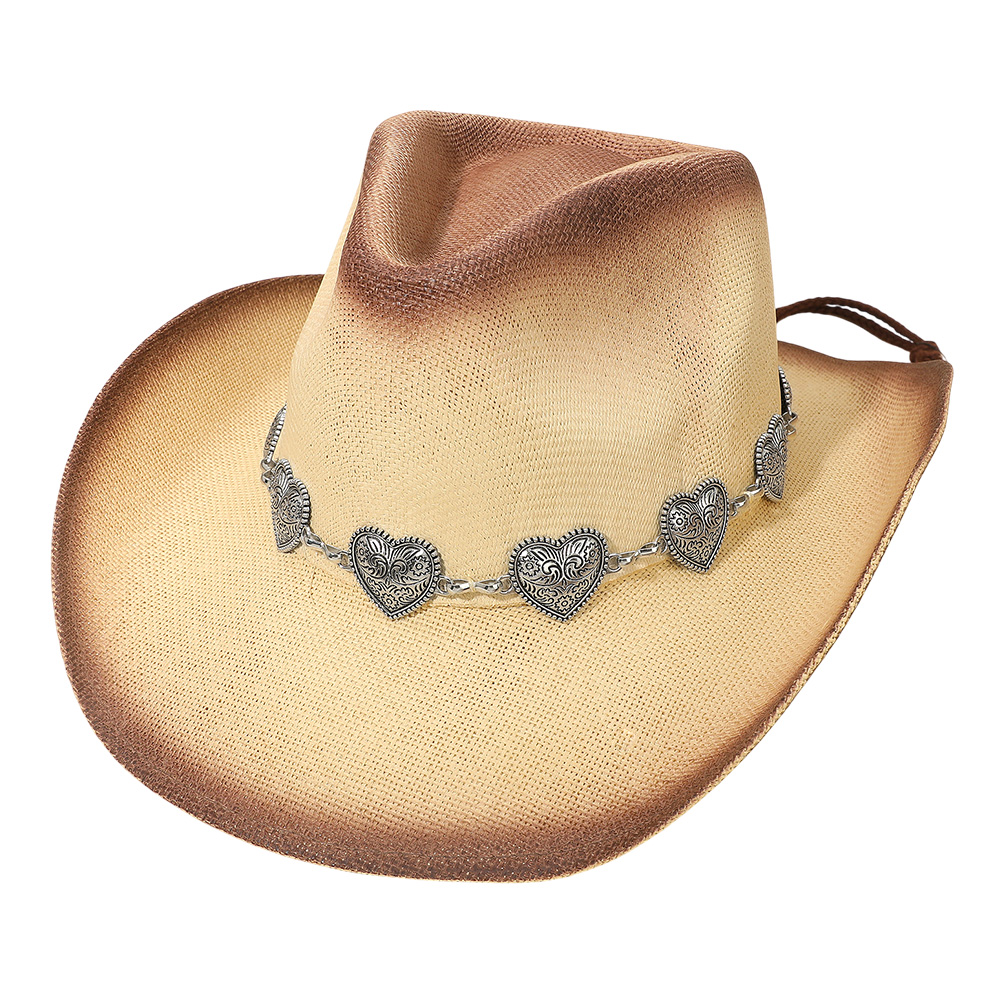 Details • Crown Circumference : 23" • Crown Height : 4.75" • Brim Height : 3.75" • Material : 98% Rayon, 2% Polyester • Turn heads with this cowboy hat featuring a band of intricate heart conchos for a unique western look. Ideal for concerts, festivals, or casual wear, it combines rustic charm with eye-catching detail, making it the perfect accessory for a bold and stylish statement.
