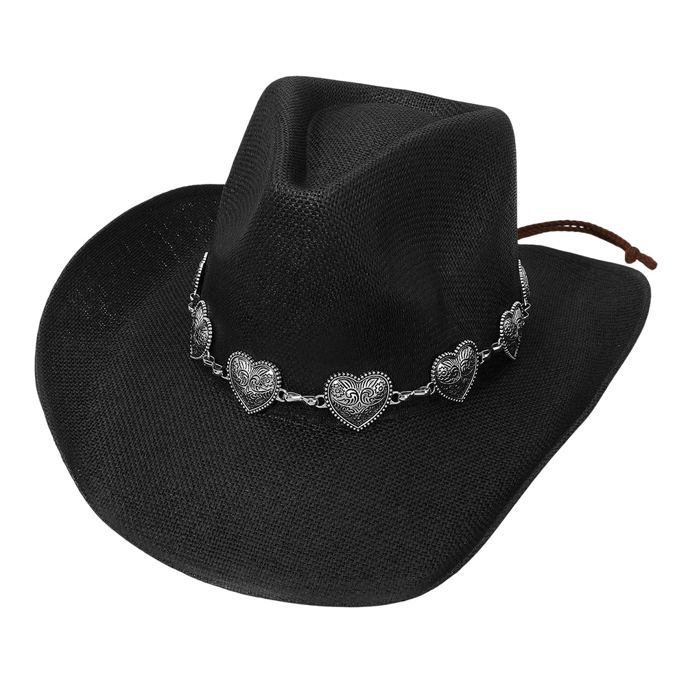 • Turn heads with this cowboy hat featuring a band of intricate heart conchos for a unique western look. Ideal for concerts, festivals, or casual wear, it combines rustic charm with eye-catching detail, making it the perfect accessory for a bold and stylish statement.