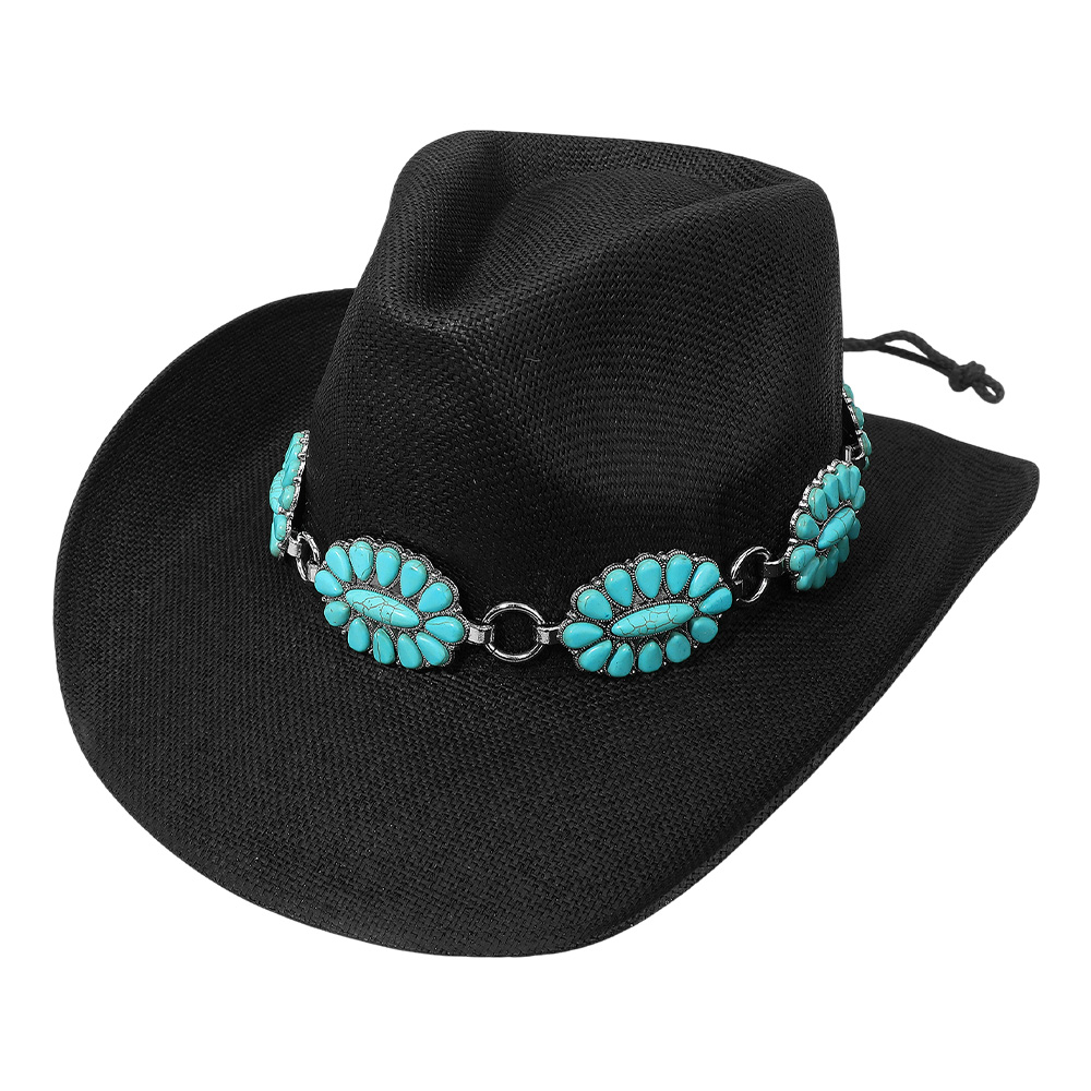 • Showcase bold western style with this cowboy hat featuring a linked concho band in a striking design. Perfect for festivals, concerts, or casual wear, it blends rugged tradition with sleek detail, making it a standout accessory for any modern cowboy look.