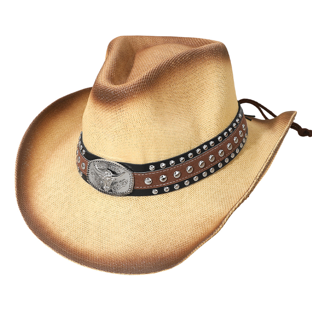 Details • Crown Circumference : 23" • Crown Height : 4.75" • Brim Height : 3.75" • Material : 98% Rayon, 2% Polyester • Command attention with this cowboy hat featuring a studded band and bold steer head concho centerpiece. Perfect for rodeos, concerts, or casual wear, it captures rugged western spirit with striking detail, making it a must-have accessory for adventurous style.