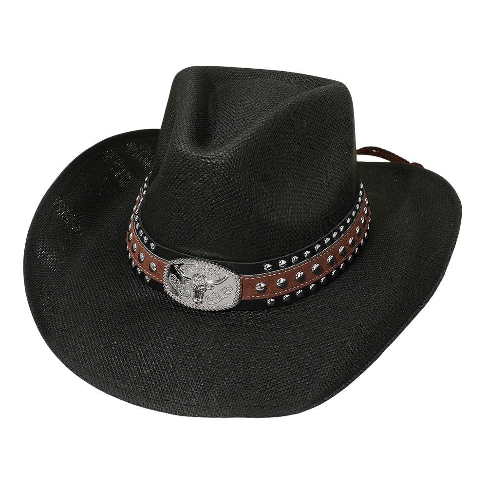 Details • Crown Circumference : 23" • Crown Height : 4.75" • Brim Height : 3.75" • Material : 98% Rayon, 2% Polyester • Command attention with this cowboy hat featuring a studded band and bold steer head concho centerpiece. Perfect for rodeos, concerts, or casual wear, it captures rugged western spirit with striking detail, making it a must-have accessory for adventurous style.
