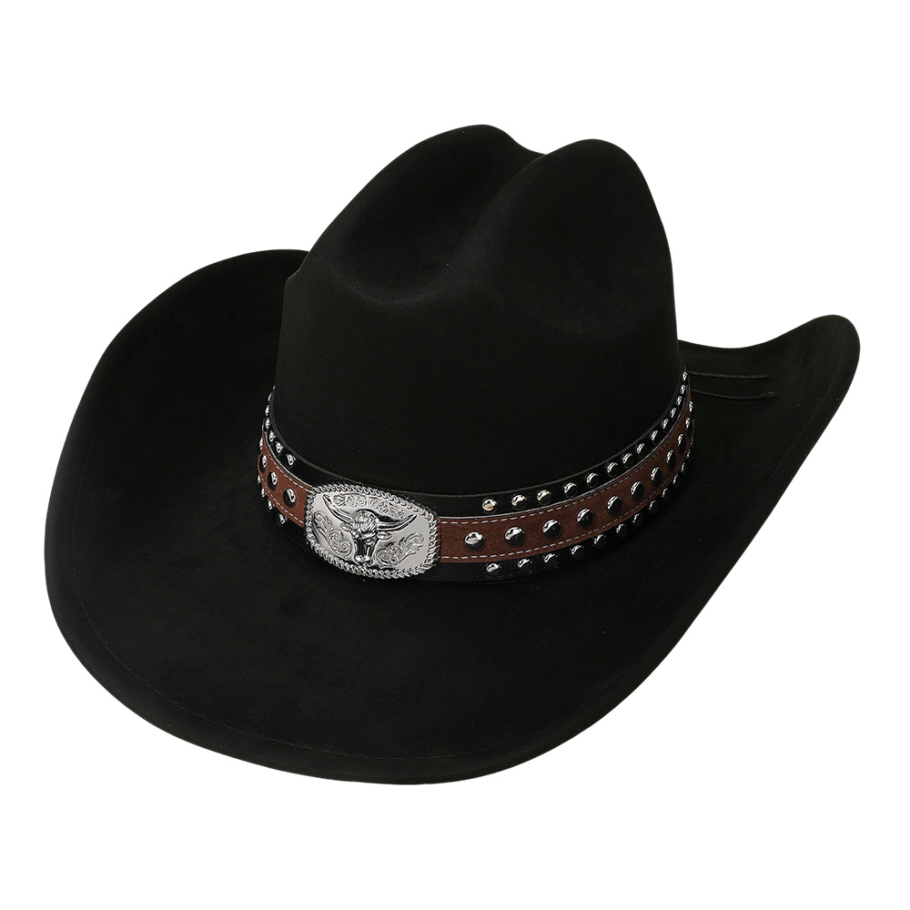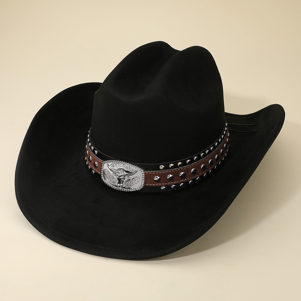 Details • Crown Circumference : 23" • Crown Height : 4.75" • Brim Height : 3.75" • Material : 100% Polyester • Western cowboy hat accented with a bold steer head buckle band, featuring studded details for a rugged finish. Perfect for rodeos, concerts, festivals, and everyday wear, this hat combines durability with authentic cowboy style, making it a standout piece in western fashion collections.