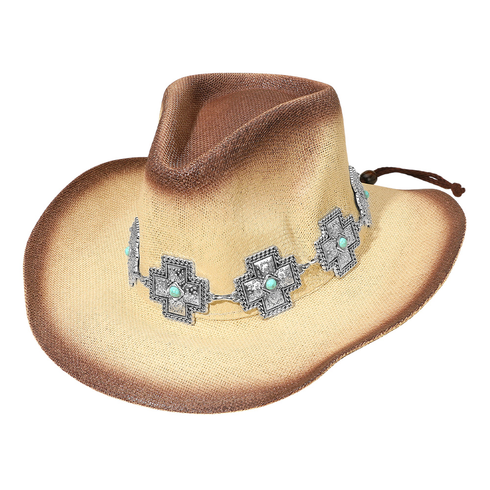 • Stand out in authentic western style with this cowboy hat featuring a striking cross concho band accented with turquoise details. Perfect for rodeos, festivals, or everyday wear, it blends rugged tradition with bold design for a distinctive statement piece.