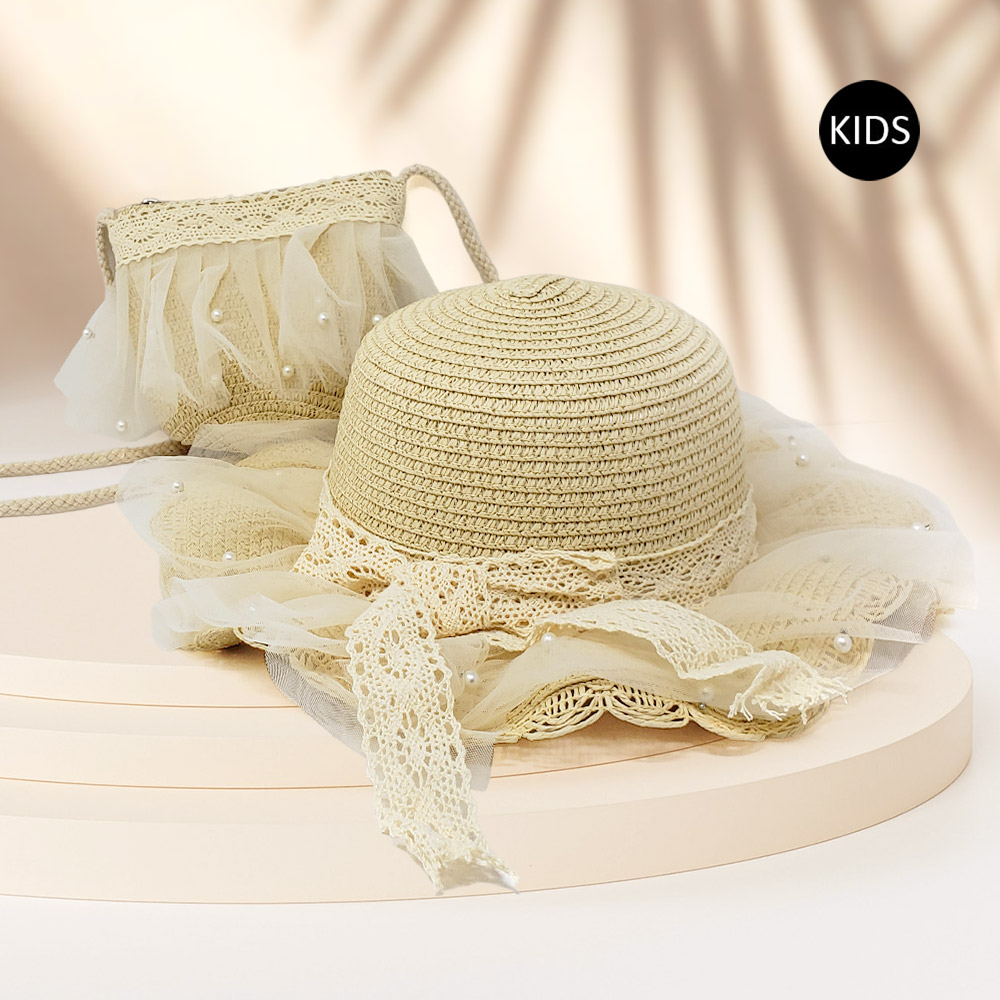 2PCS - Pearl Embellished Straw Kids Sun Hat Crossbody Bag Set