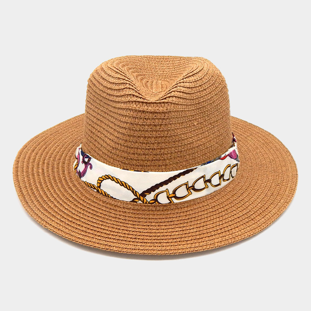 Chain Printed Silk Like Fabric Band Straw Fedora Hat