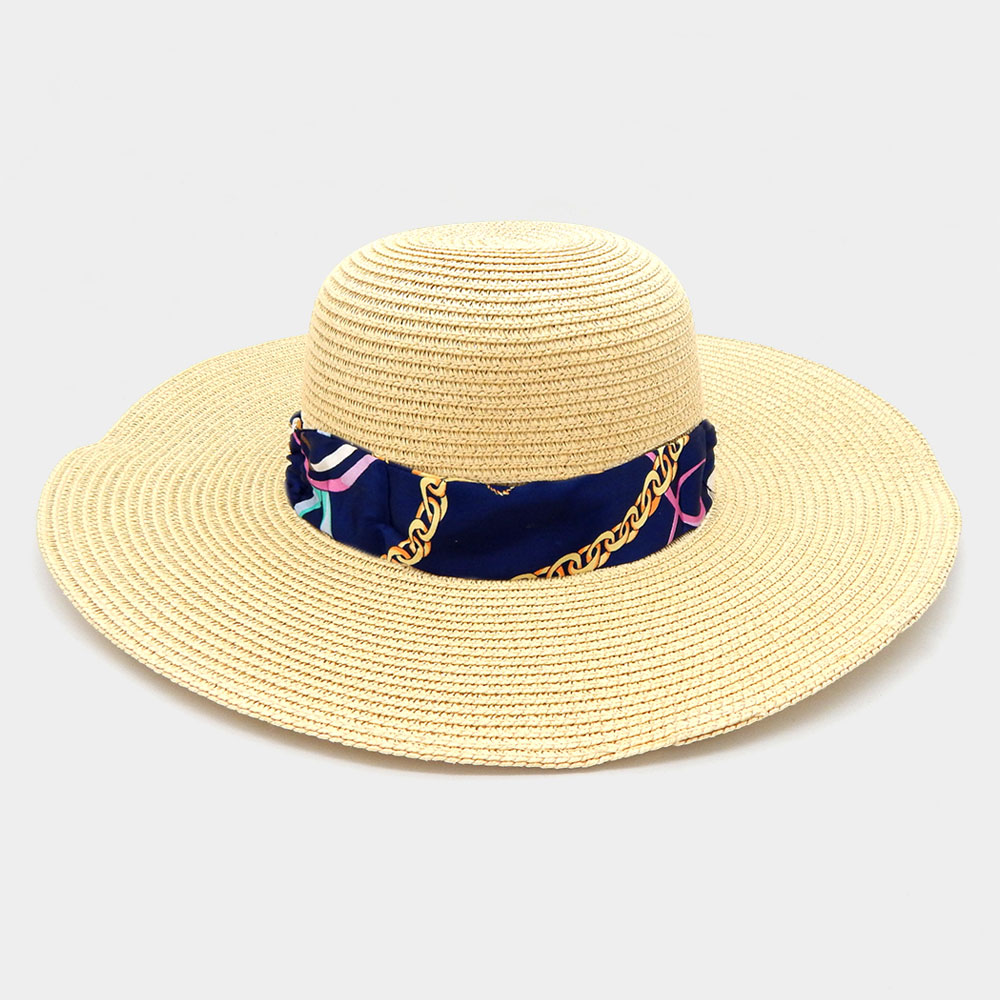 Wide Brim Chain Printed Silk Like Fabric Band Straw Hat
