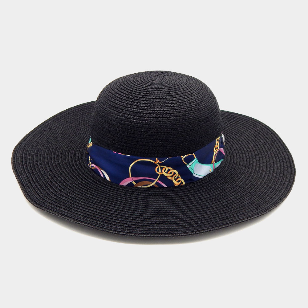 Wide Brim Chain Printed Silk Like Fabric Band Straw Hat