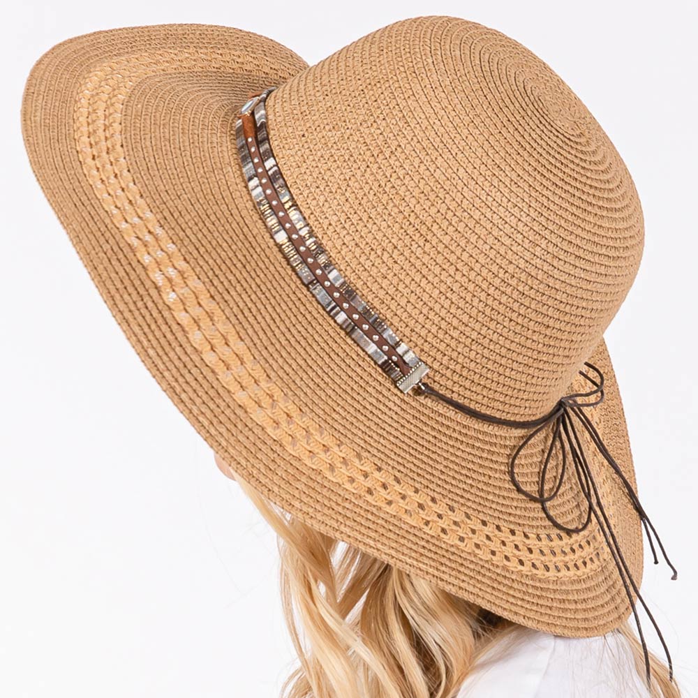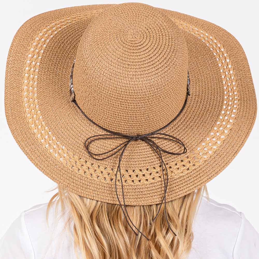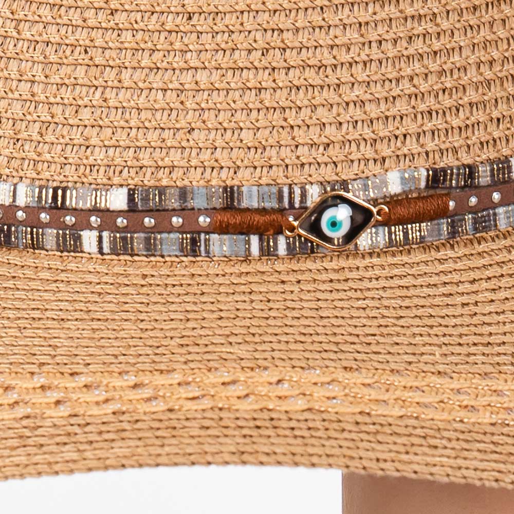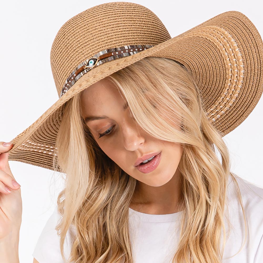 Wide Brim Straw Sun Hat with Evil Eye and Multi Design Band