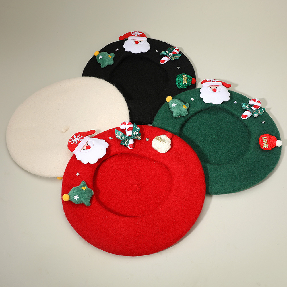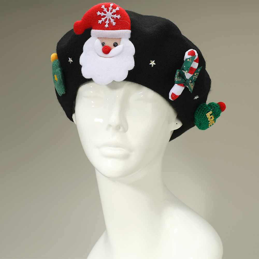 Details • Size : 10.5" X 10.5" • Festive Christmas beret hat featuring a cheerful Santa design, candy cane, and holiday-themed details. A playful accessory perfect for parties, gatherings, and seasonal outfits. Add charm and holiday cheer to your winter look with this fun Christmas hat, ideal for gifting or festive celebrations.