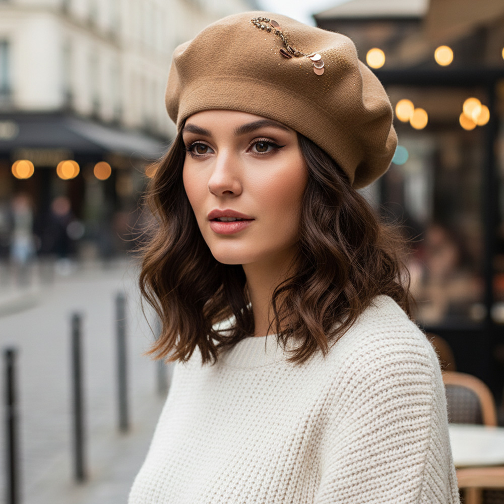 • Chic beret featuring a subtle decorative accent, perfect for adding a touch of Parisian flair to everyday outfits. Stylish and versatile, this accessory elevates casual and dressy looks with timeless charm and effortless elegance.