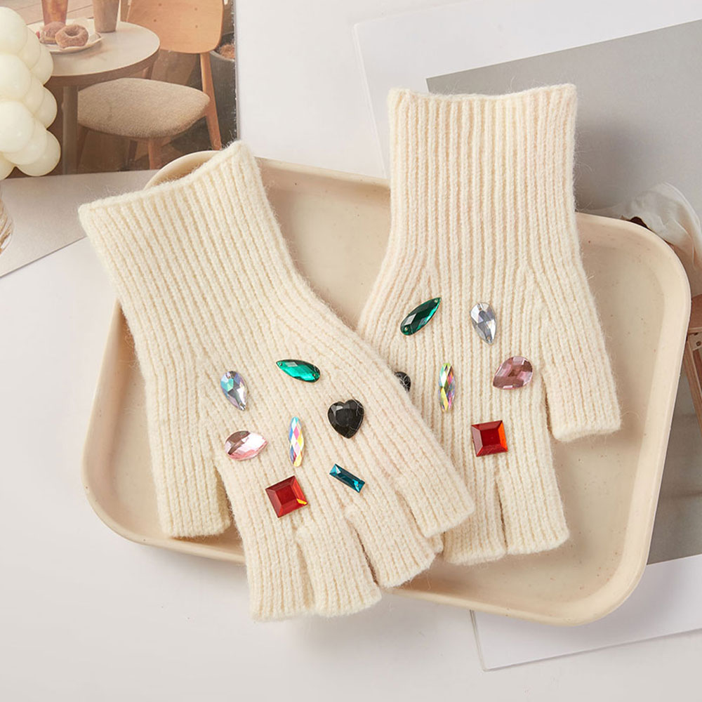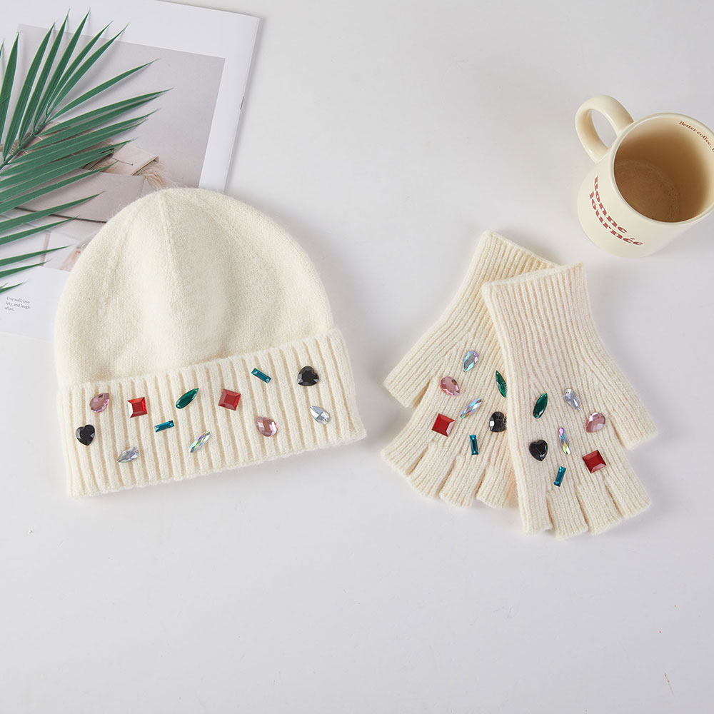 Various Shaped Stone Cluster Embellished Knit Beanie Hat Gloves Set