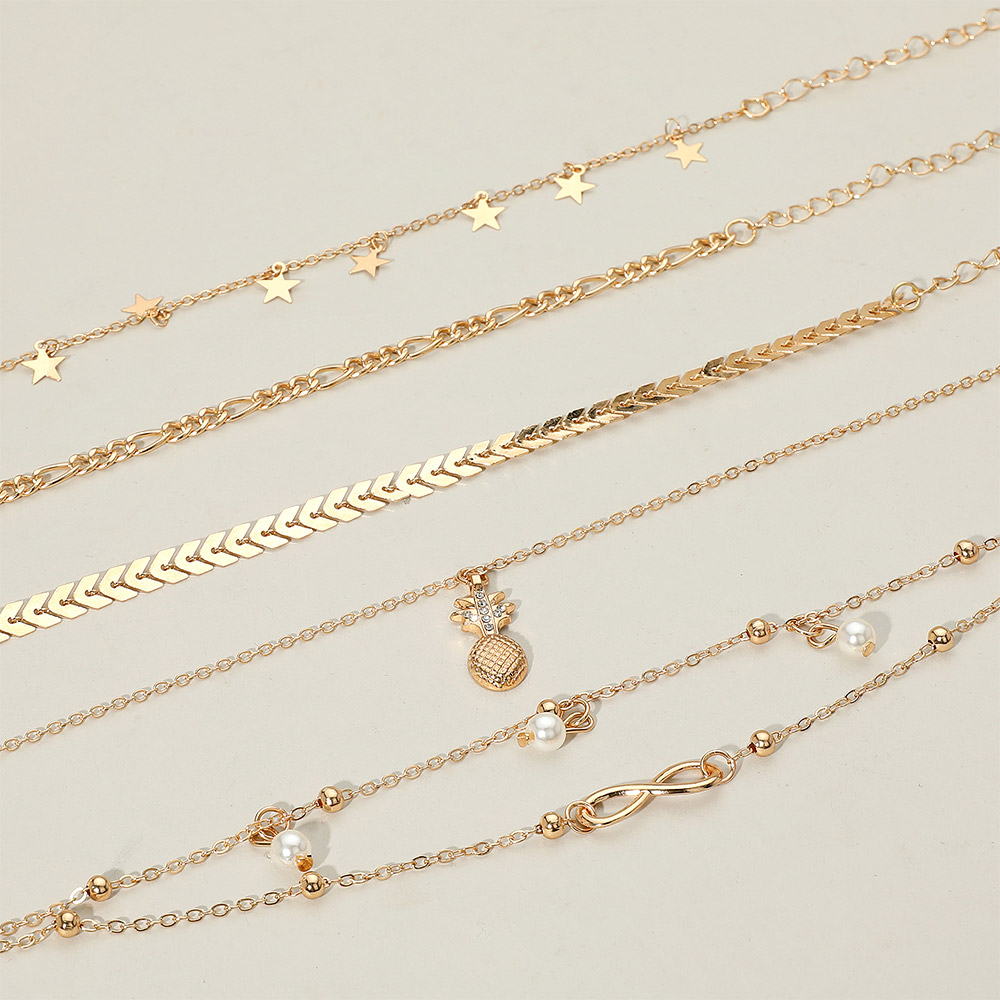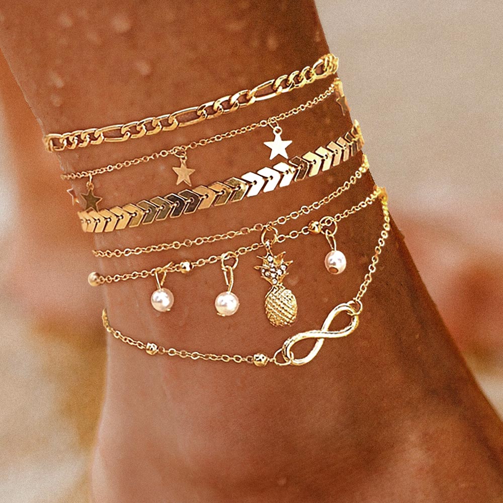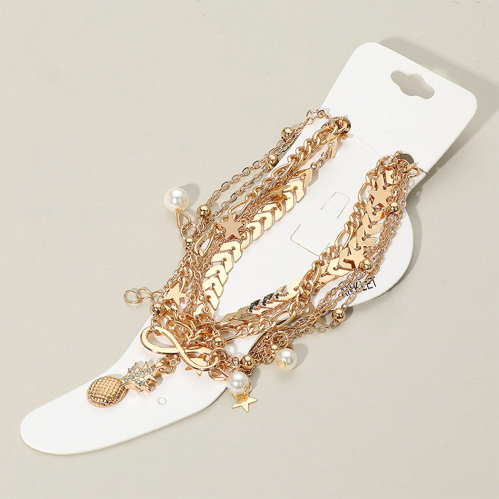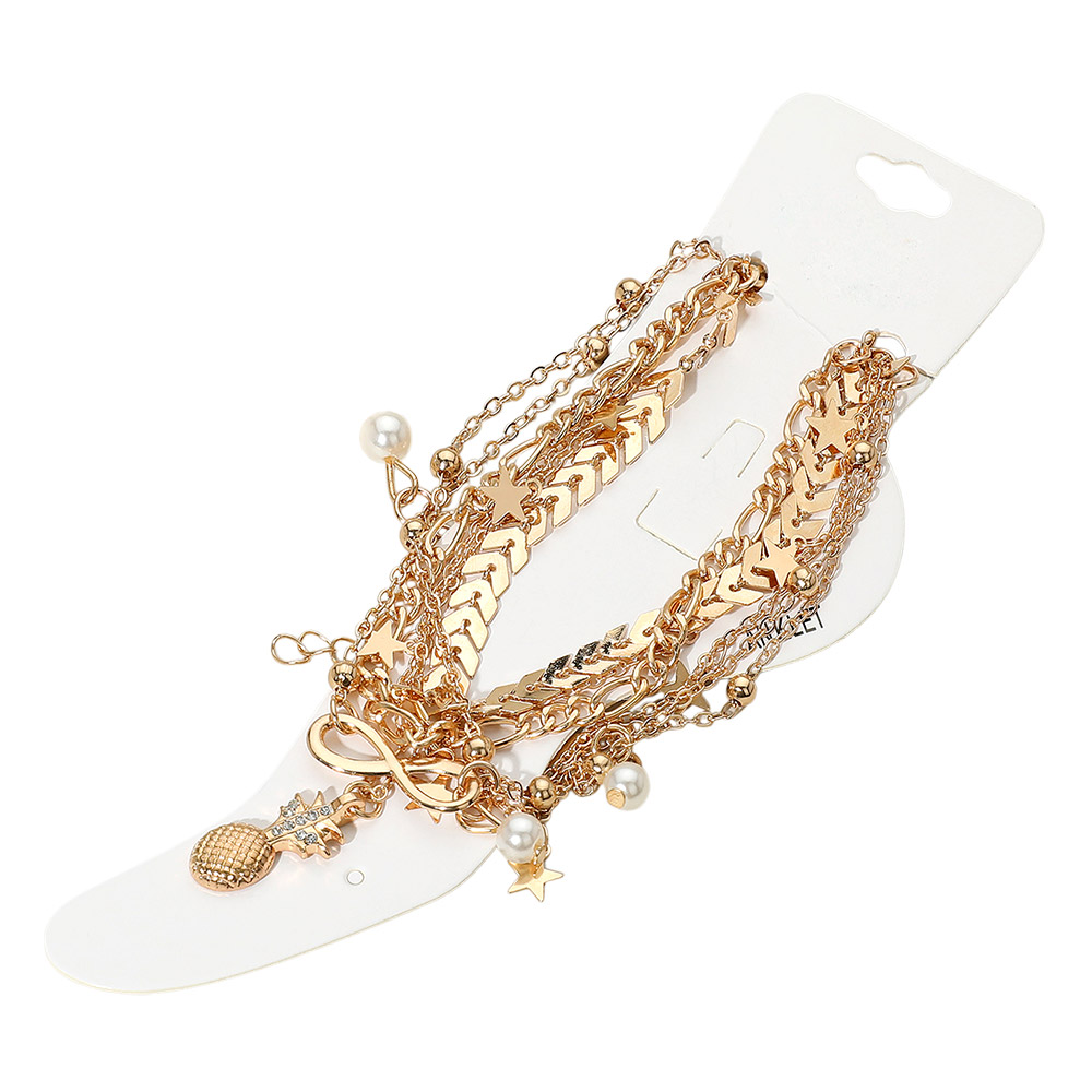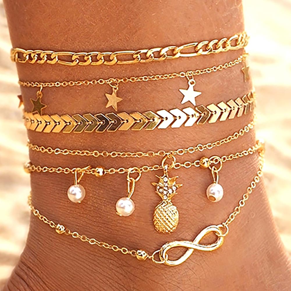5PCS - Pineapple Star Pearl Infinity Charm Accent Boho Layered Chain Anklet Set