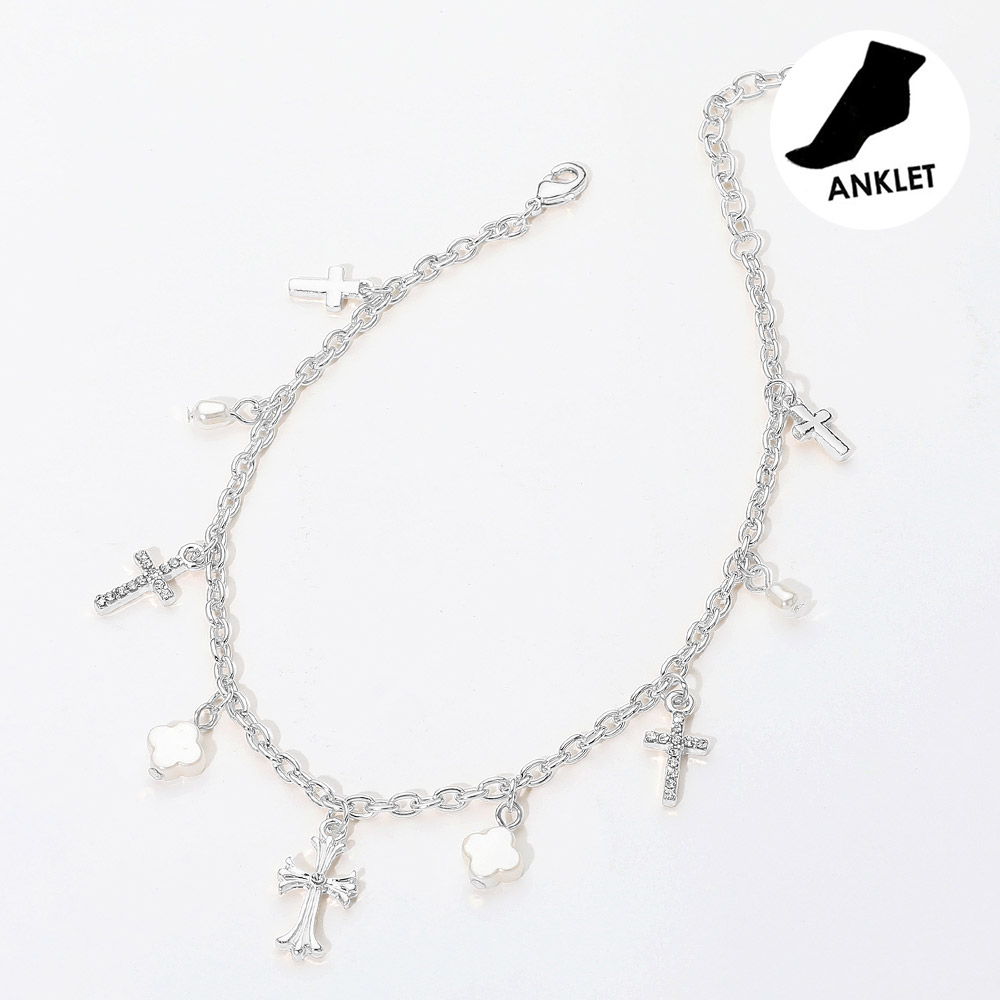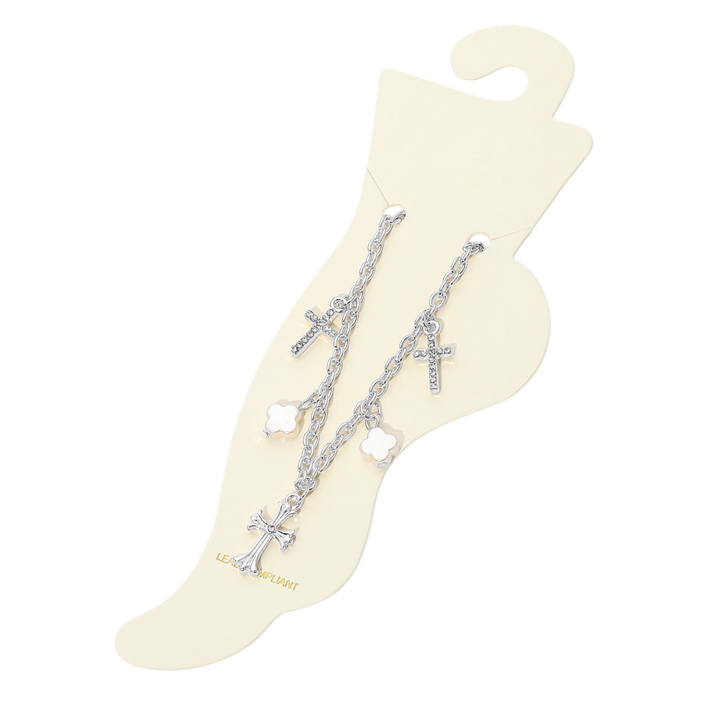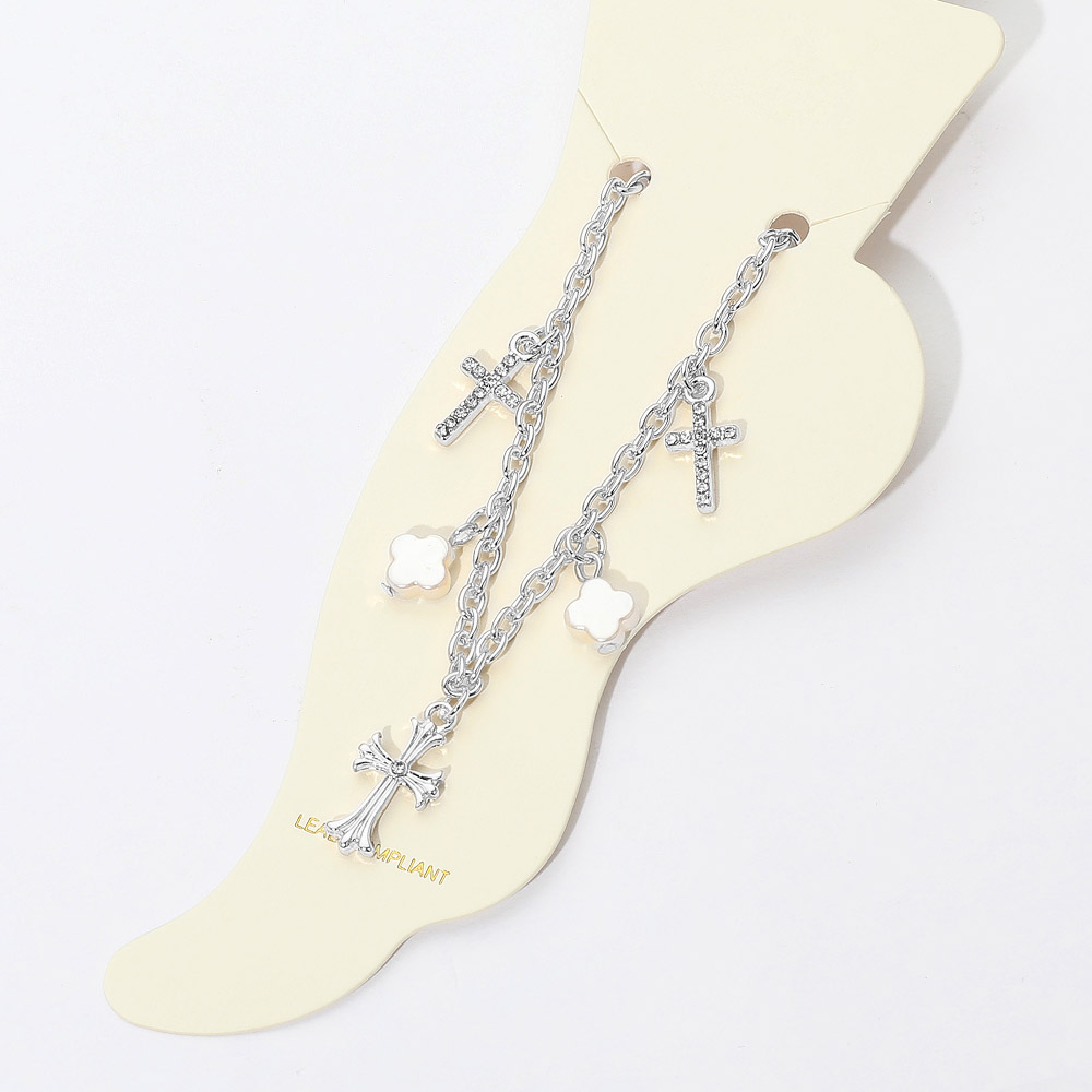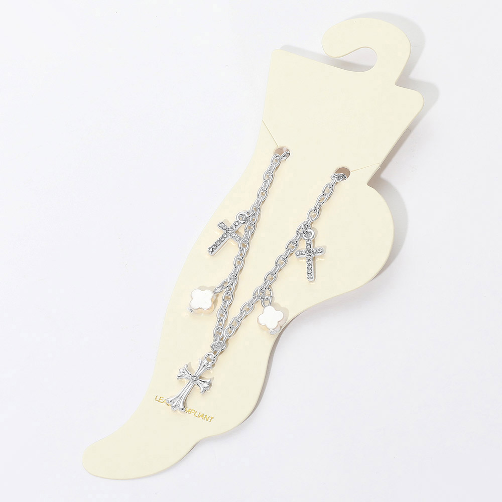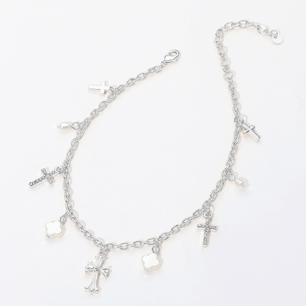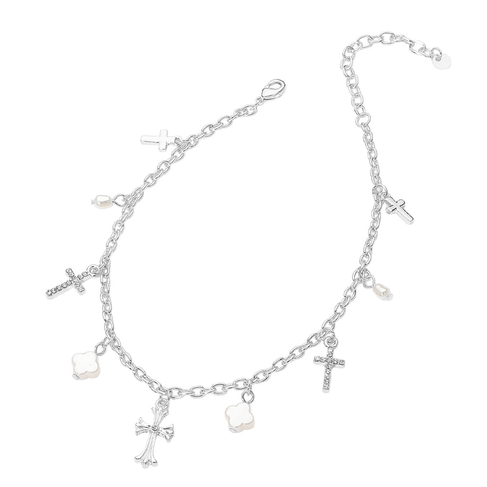 Stone Paved Cross Charm Pointed Beaded Metal Paperclip Chain Layered Bracelet