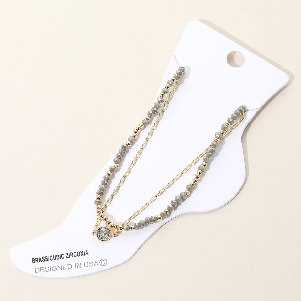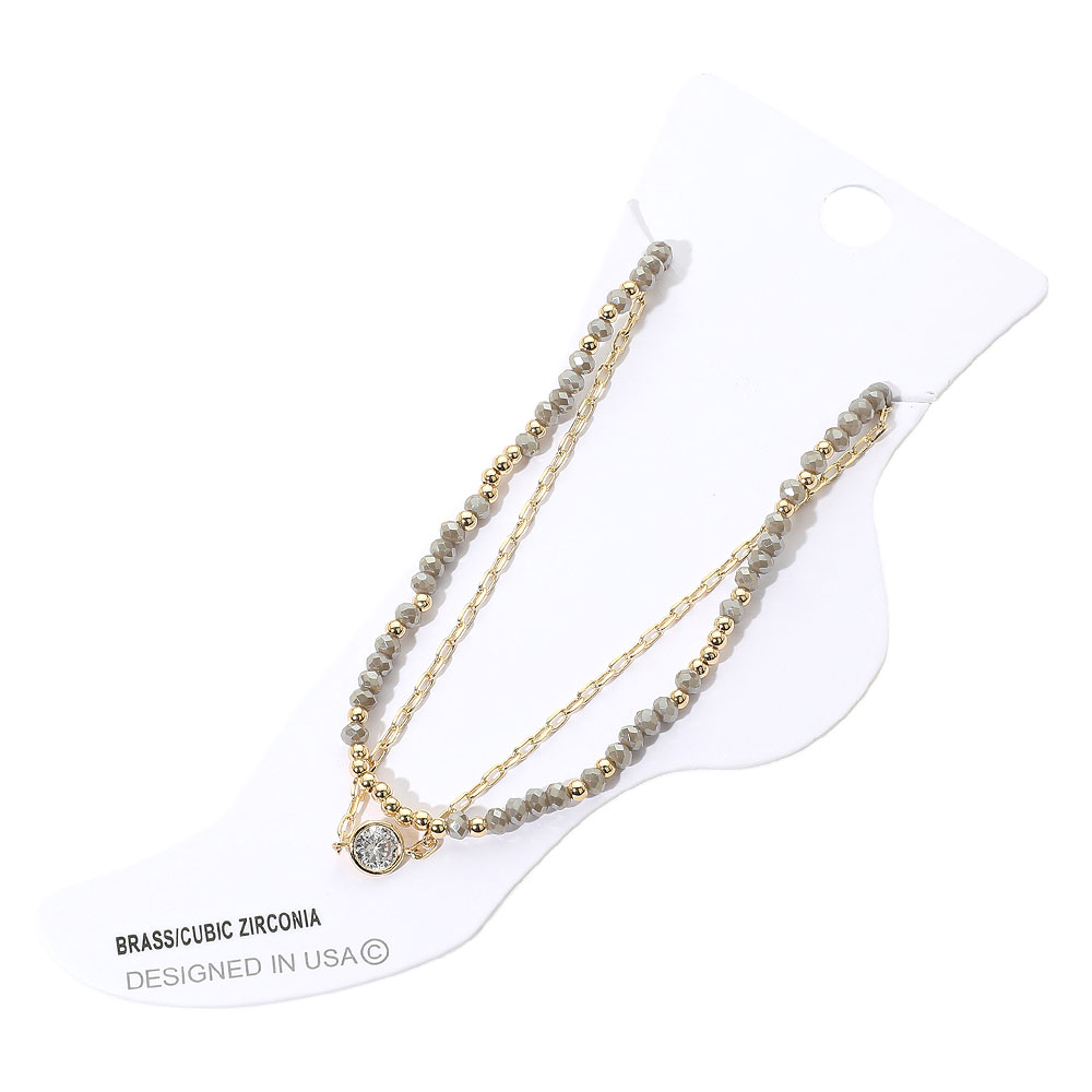 CZ Stone Bezel Accent Paperclip Chain Faceted Beaded Layered Anklet