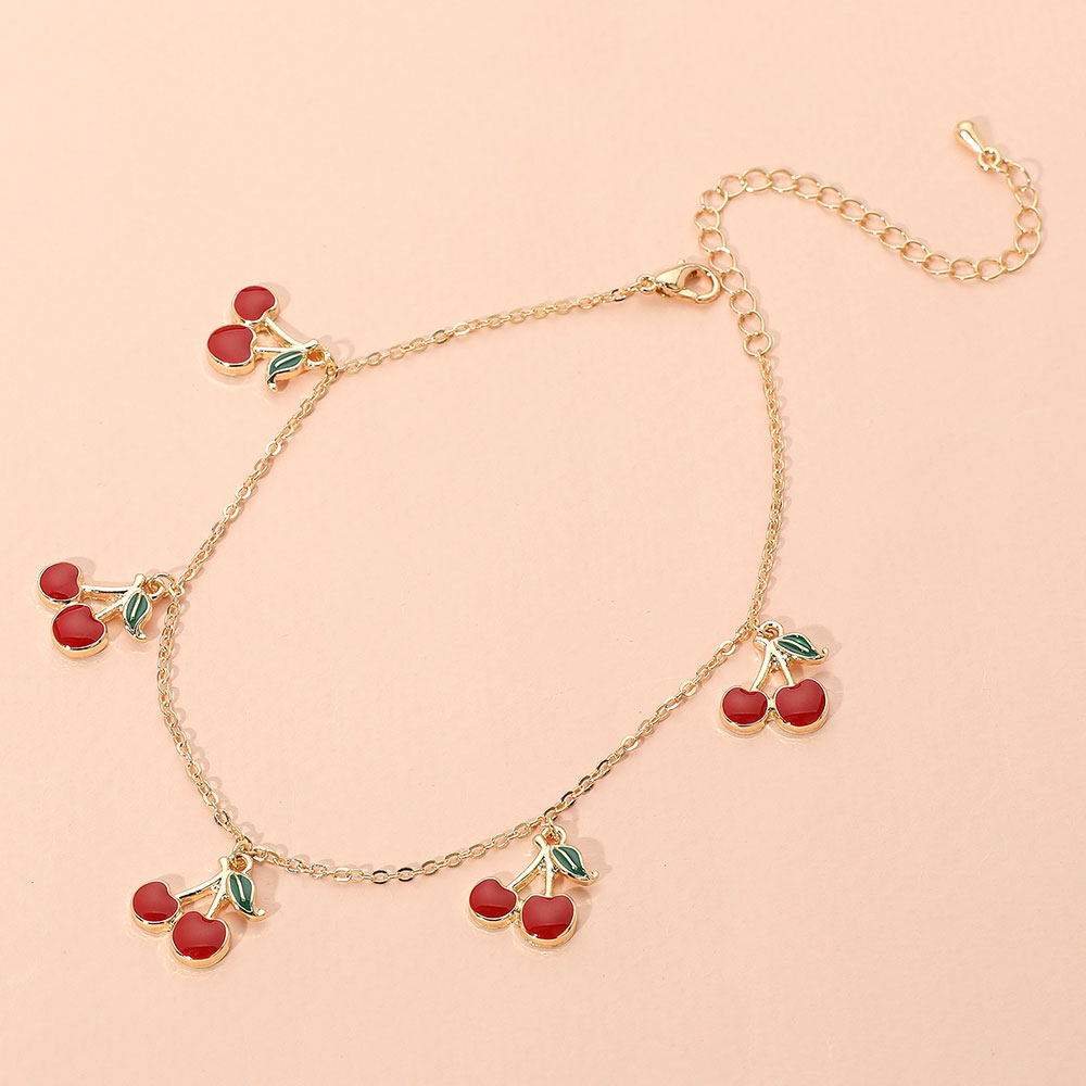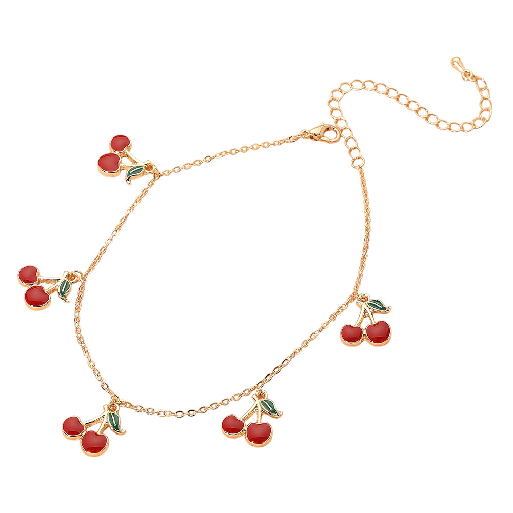 Details • Size : 0.7" H, 8.5" + 3.5" L • Lobster Clasp Closure • Playful anklet adorned with cherry-shaped charms and delicate chain design. Adds a fun, flirty touch to your summer look, perfect for beach days, festivals, or casual outfits. Adjustable fit for comfort and style. • Lead and Nickel Compliant