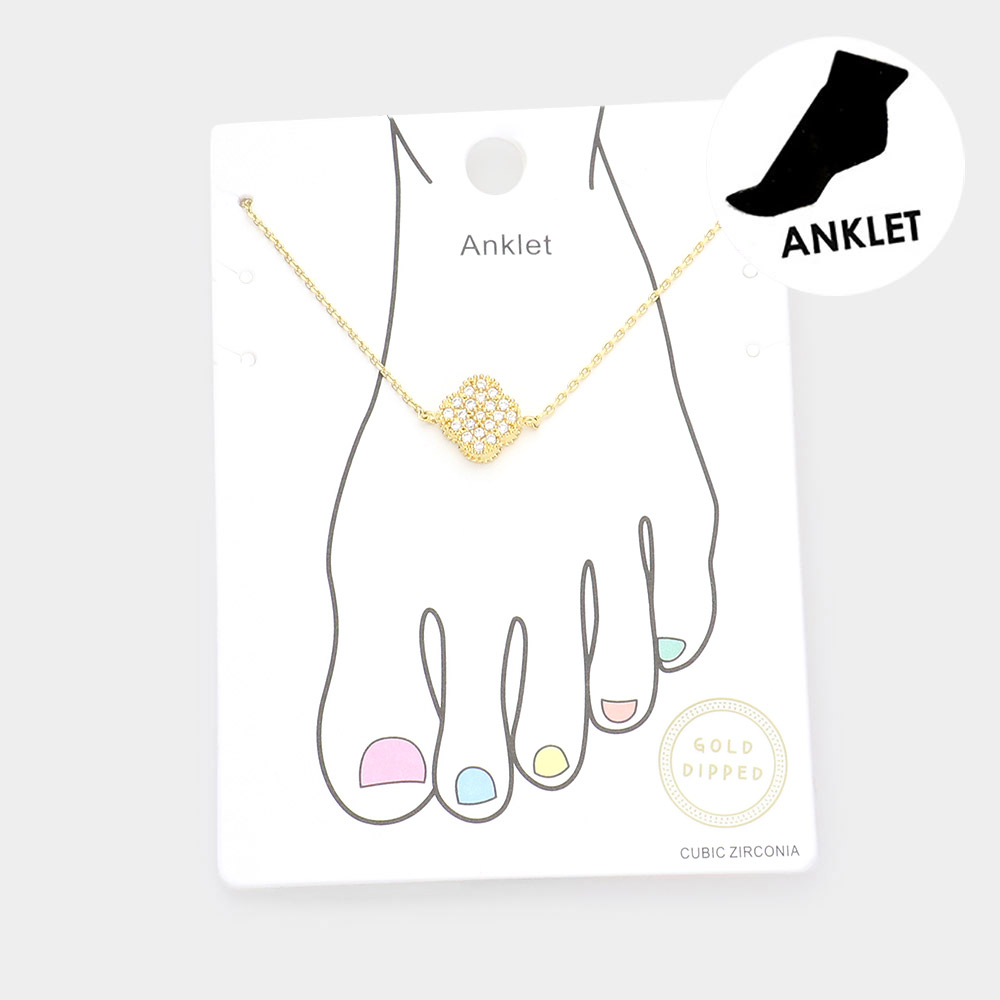 White Gold Dipped CZ Embellished Quatrefoil Charm Anklet