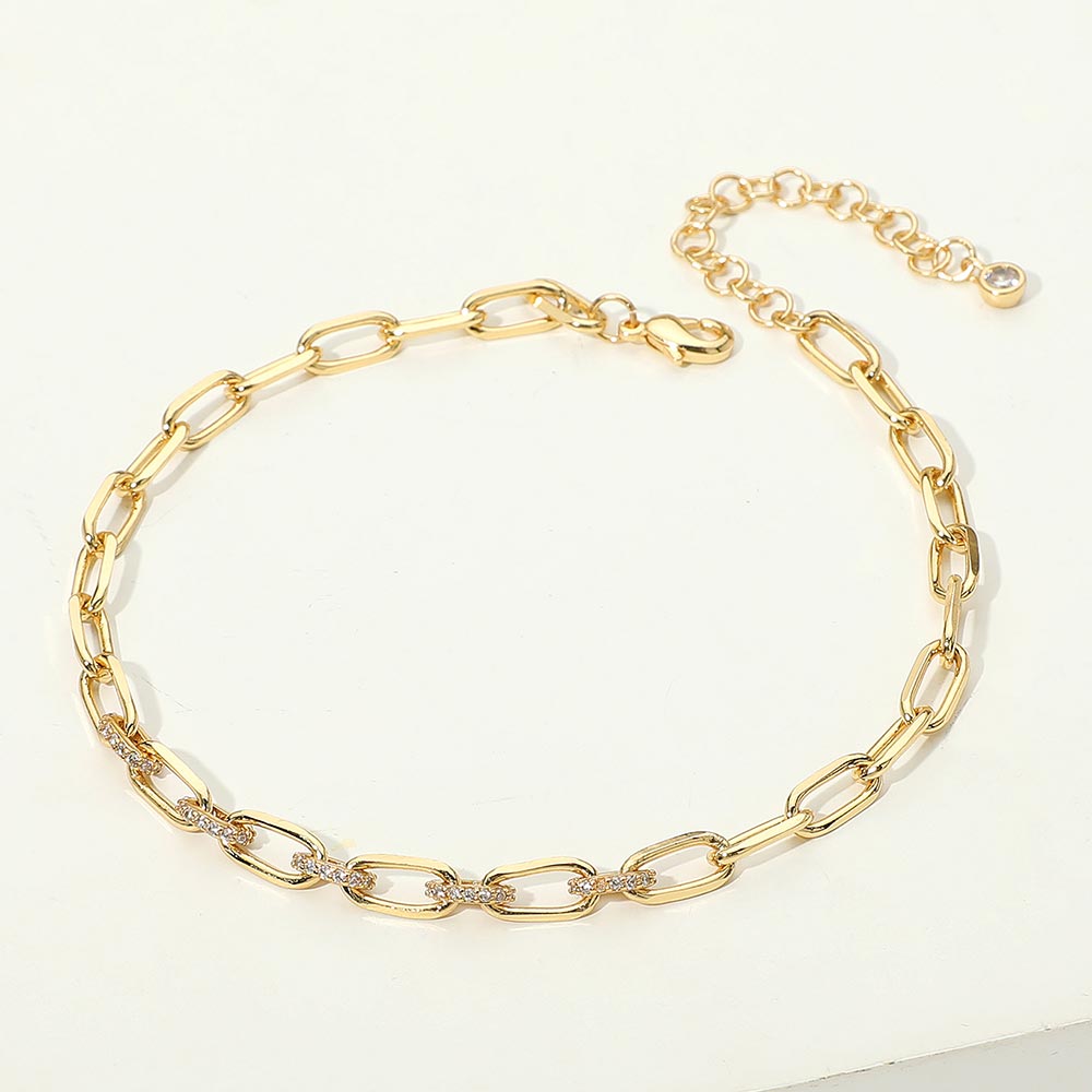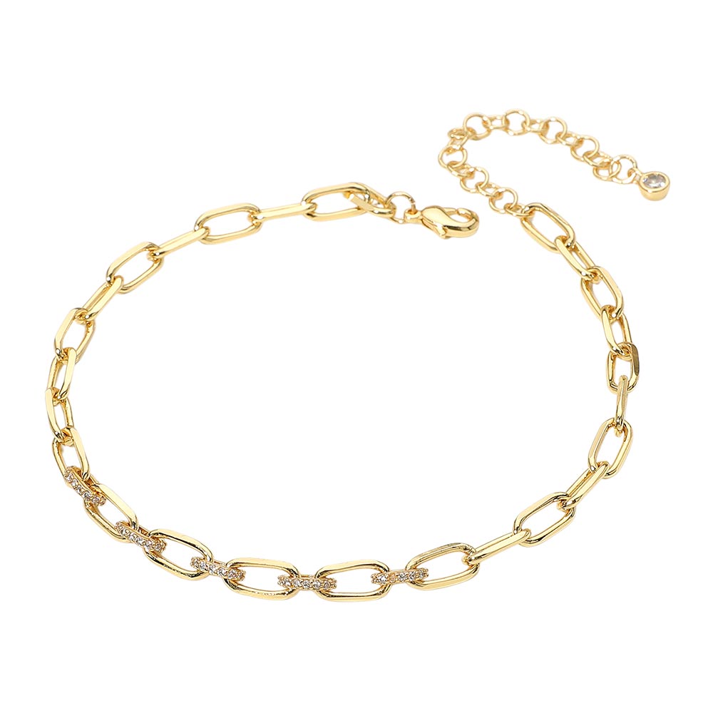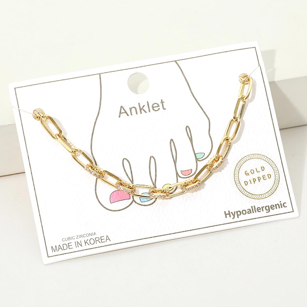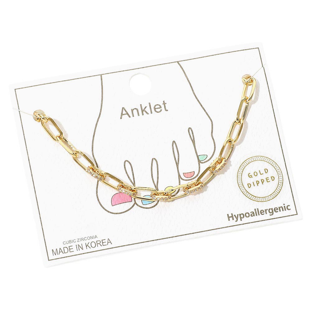 Details • Size : 0.2" H, 9" + 2" L • Lobster Clasp Closure • This gold-dipped anklet features a contemporary paperclip chain enhanced with sparkling cubic zirconia links for a subtle touch of glamour. Hypoallergenic and stylish, it’s perfect for summer wear or layering with other ankle jewelry for a modern, effortless look. • CZ Cubic Zirconia • Gold Dipped • Hypoallergenic • Lead and Nickel Compliant • Made In Korea
