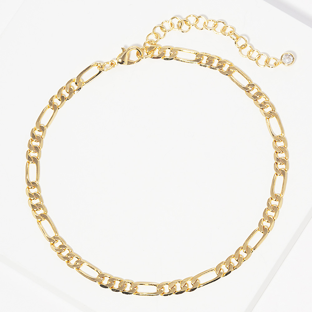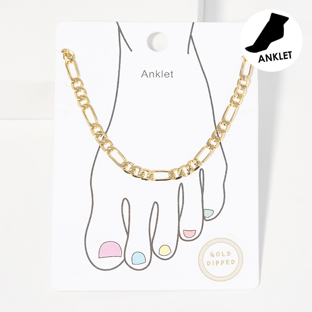 Details • Size : 0.2" H, 8.5" + 2" L • Lobster Clasp Closure • This gold-dipped anklet features a classic Figaro chain design with alternating link sizes for timeless appeal. Hypoallergenic and sleek, it offers a comfortable fit and subtle shine—ideal for everyday wear or pairing with other anklets for a layered, on-trend look. • Lead and Nickel Compliant • Hypoallergenic • Made In Korea • Gold Dipped