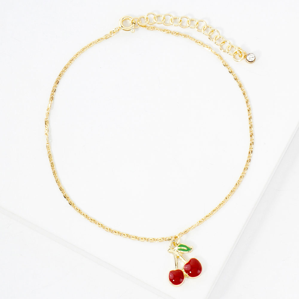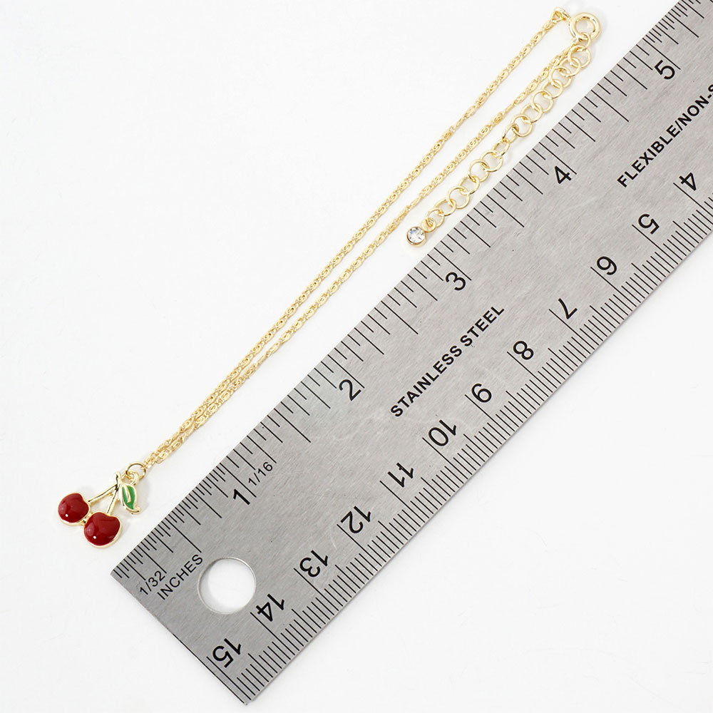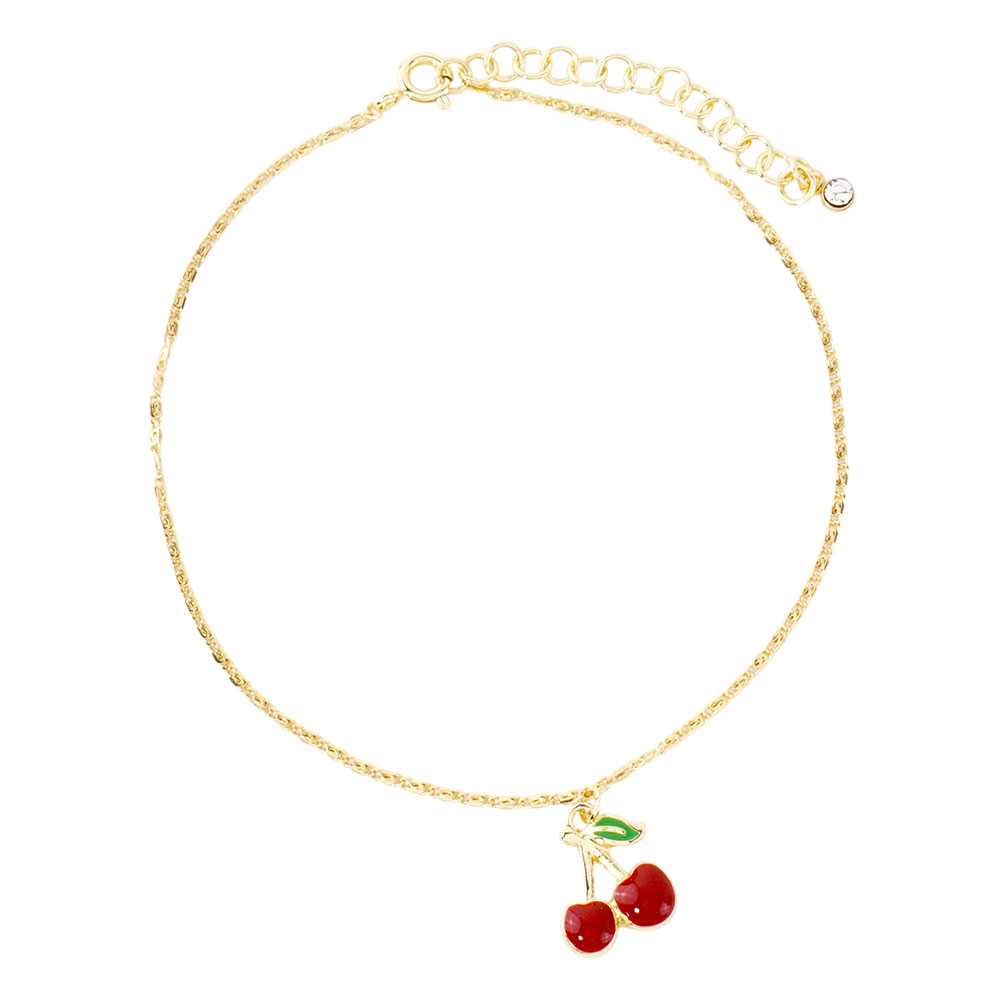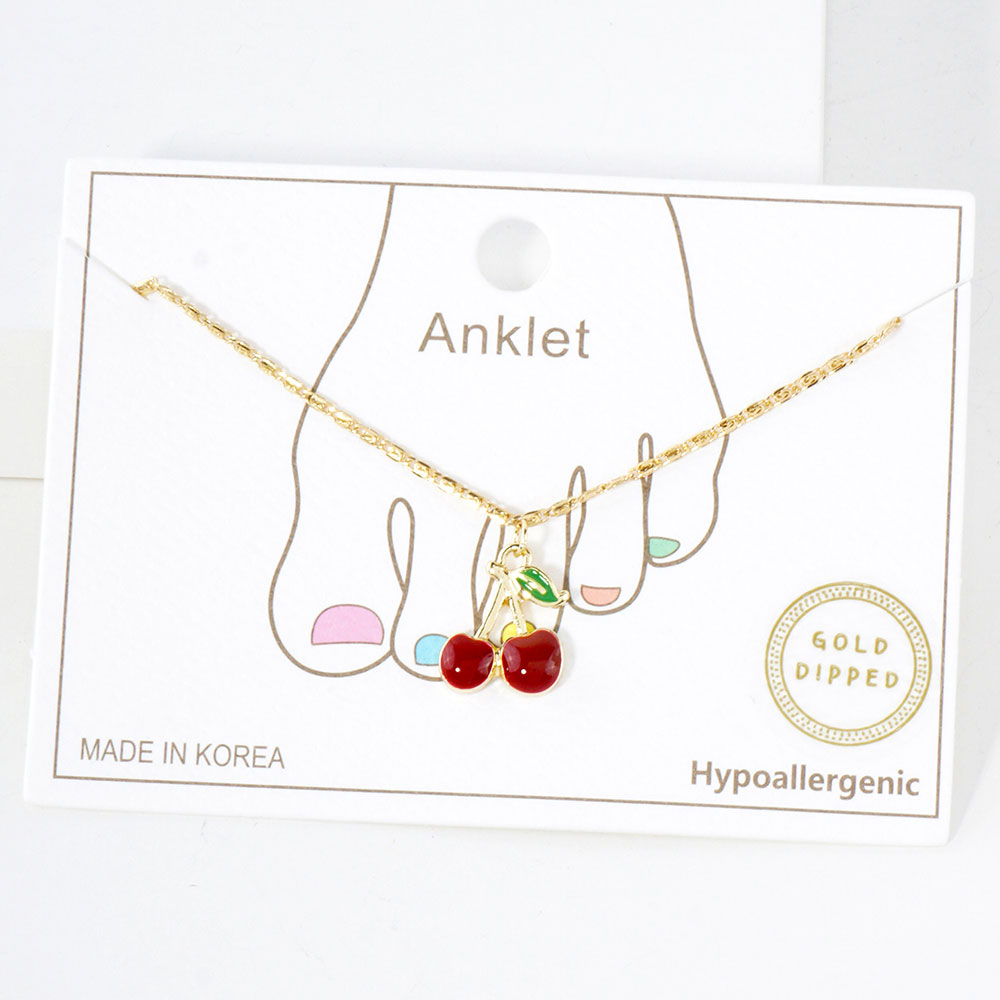 Details • Size : 8.5" + 2" L • Charm Size : 0.7" L • Lobster Clasp Closure • One Side Only • Adorable cherry anklets dipped in gold and white gold. Hypoallergenic and perfect for a playful summer look. Made in Korea with delicate charm details. • Gold Dipped • Hypoallergenic • Lead and Nickel Compliant • Made In Korea