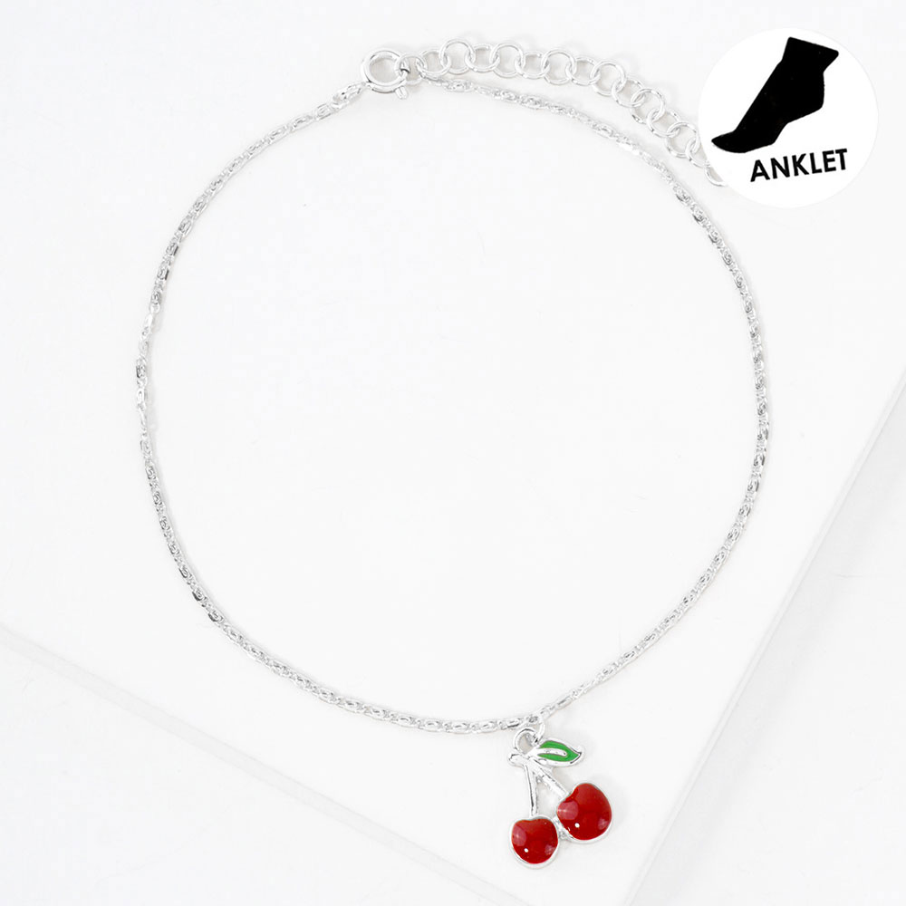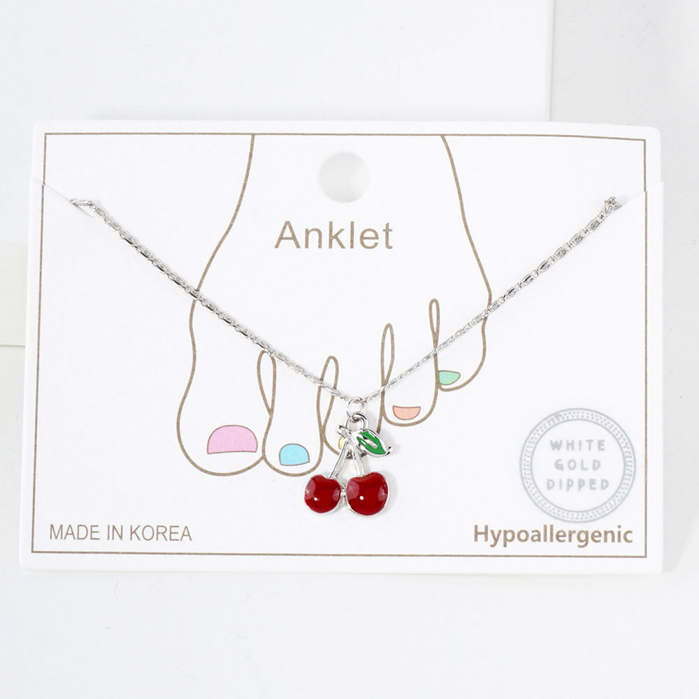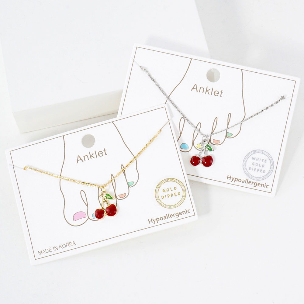Details • Size : 8.5" + 2" L • Charm Size : 0.7" L • Lobster Clasp Closure • One Side Only • Adorable cherry anklets dipped in gold and white gold. Hypoallergenic and perfect for a playful summer look. Made in Korea with delicate charm details. • Gold Dipped • Hypoallergenic • Lead and Nickel Compliant • Made In Korea