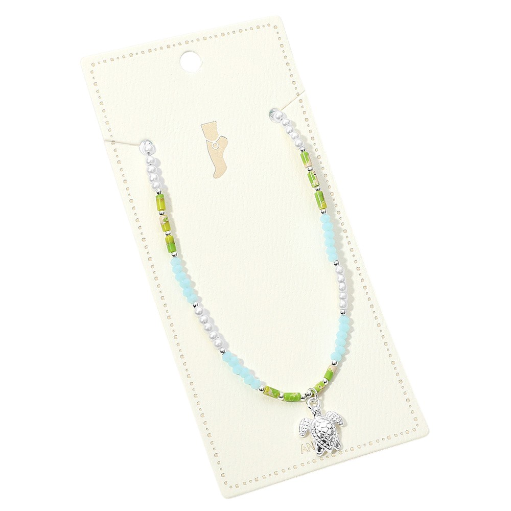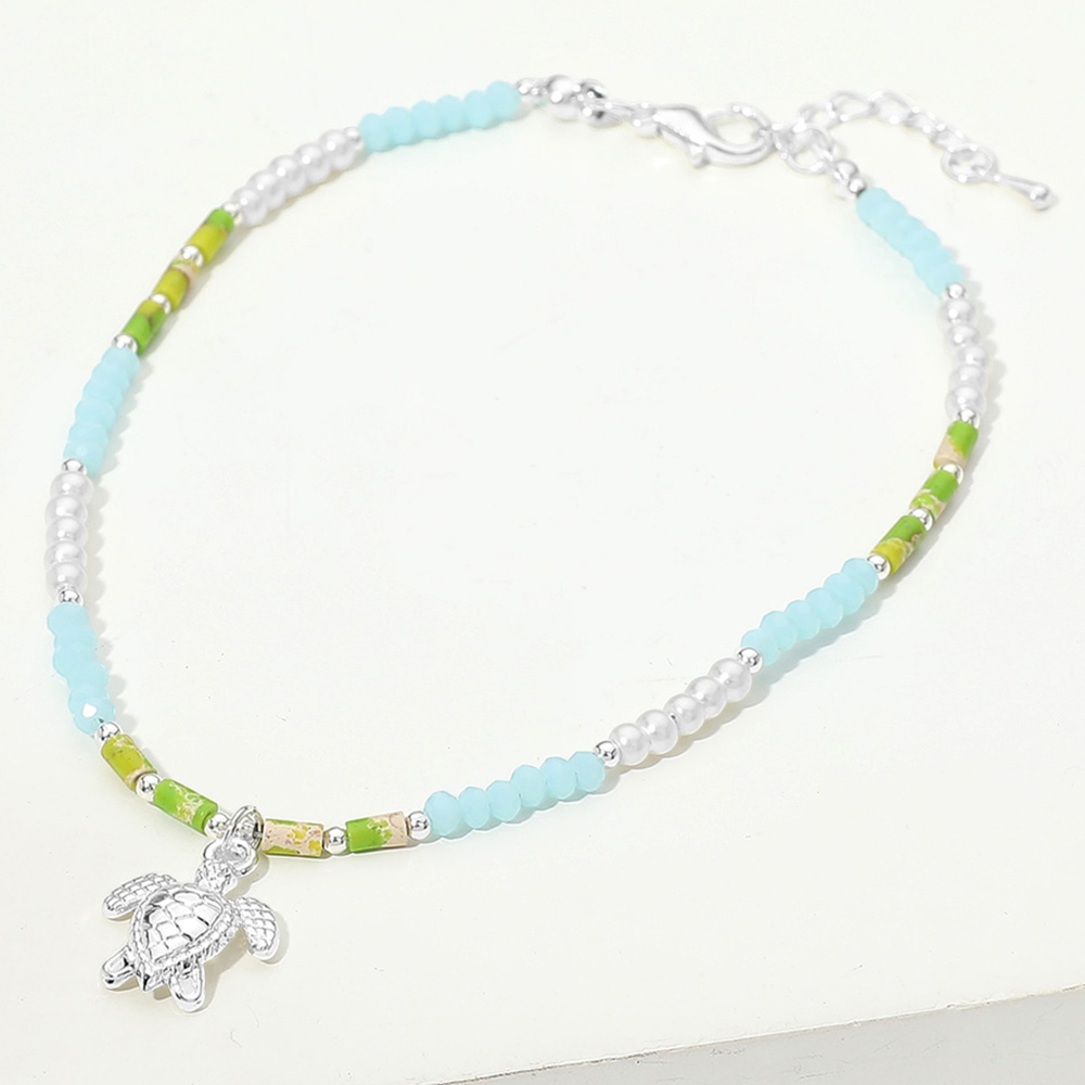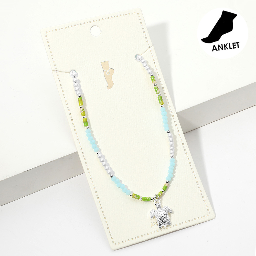 Metal Sea Turtle Charm Pearl Faceted Beaded Anklet