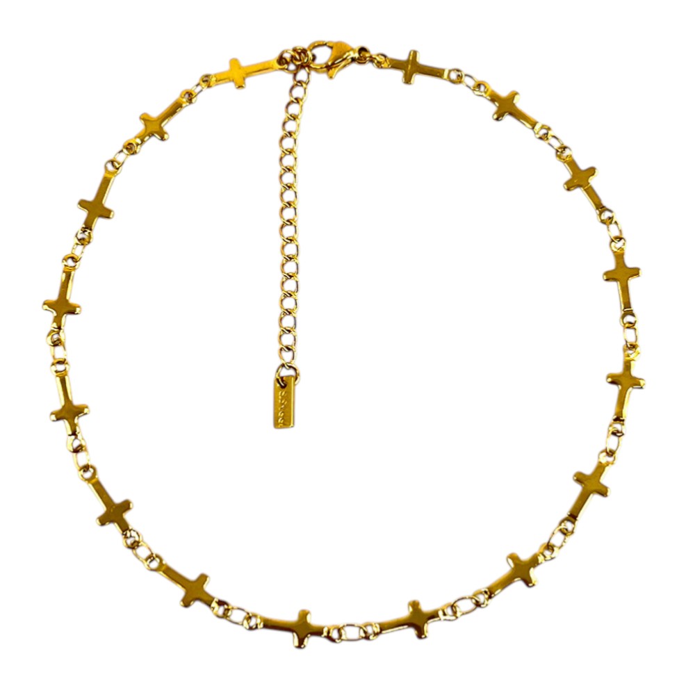 Details • Size : 0.2" H, 9.5" + 2.5" L • Lobster Clasp Closure • Stylish anklet adorned with mini cross charms on a delicate stainless steel chain. Lightweight and durable design perfect for daily wear or layering with other accessories. • Stainless Steel