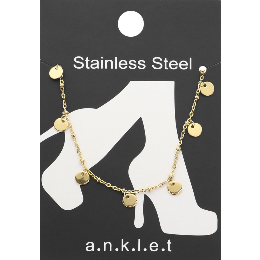 Details • Size : 0.4" H, 8.25" + 2.75" L • Lobster Clasp Closure • Minimalist anklet crafted from stainless steel and adorned with dangling disc charms for a subtle shimmer. This delicate chain design is perfect for adding a touch of elegance to sandals or heels, making it a versatile accessory for both casual and dressy looks. • Stainless Steel