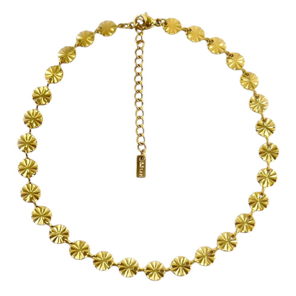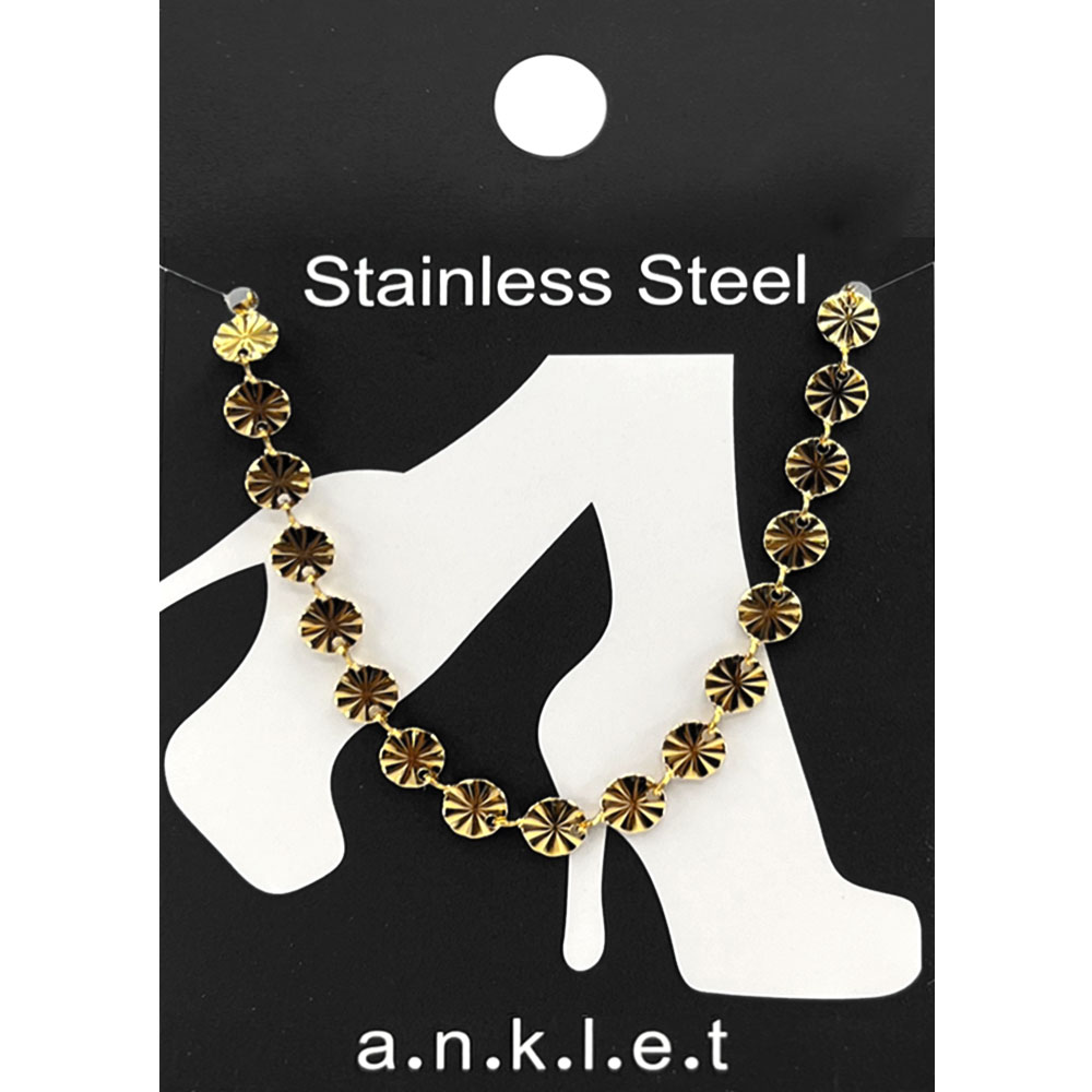 Details • Size : 0.25" H, 9.5" + 2.5" L • Lobster Clasp Closure • Modern stainless steel anklet featuring fan-textured round discs. Adds eye-catching movement and a refined edge to casual or dressy styles. Durable and comfortable for everyday wear. • Stainless Steel