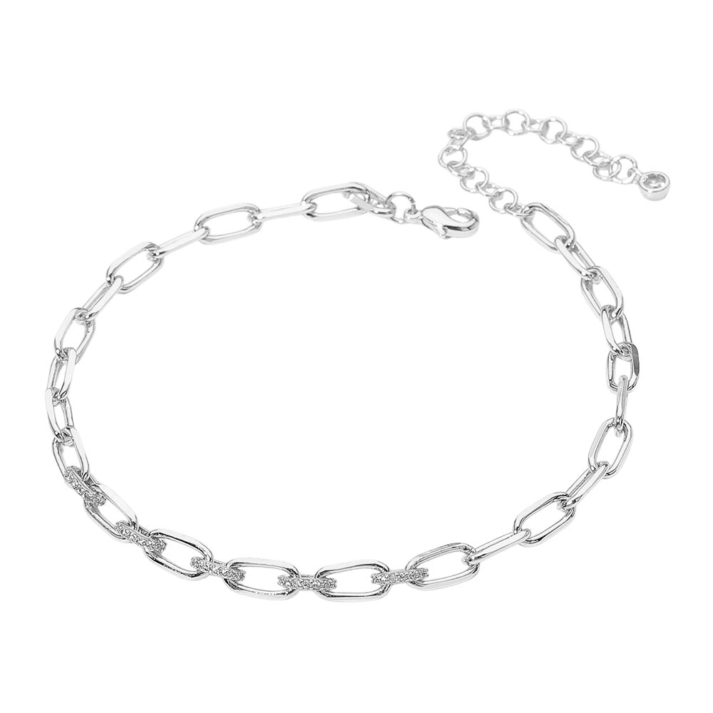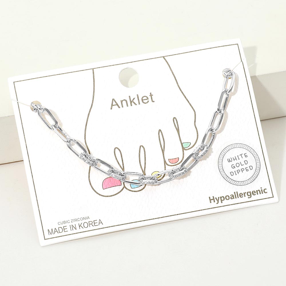 Details • Size : 0.2" H, 9" + 2" L • Lobster Clasp Closure • This gold-dipped anklet features a contemporary paperclip chain enhanced with sparkling cubic zirconia links for a subtle touch of glamour. Hypoallergenic and stylish, it’s perfect for summer wear or layering with other ankle jewelry for a modern, effortless look. • CZ Cubic Zirconia • Gold Dipped • Hypoallergenic • Lead and Nickel Compliant • Made In Korea