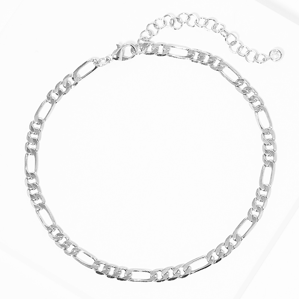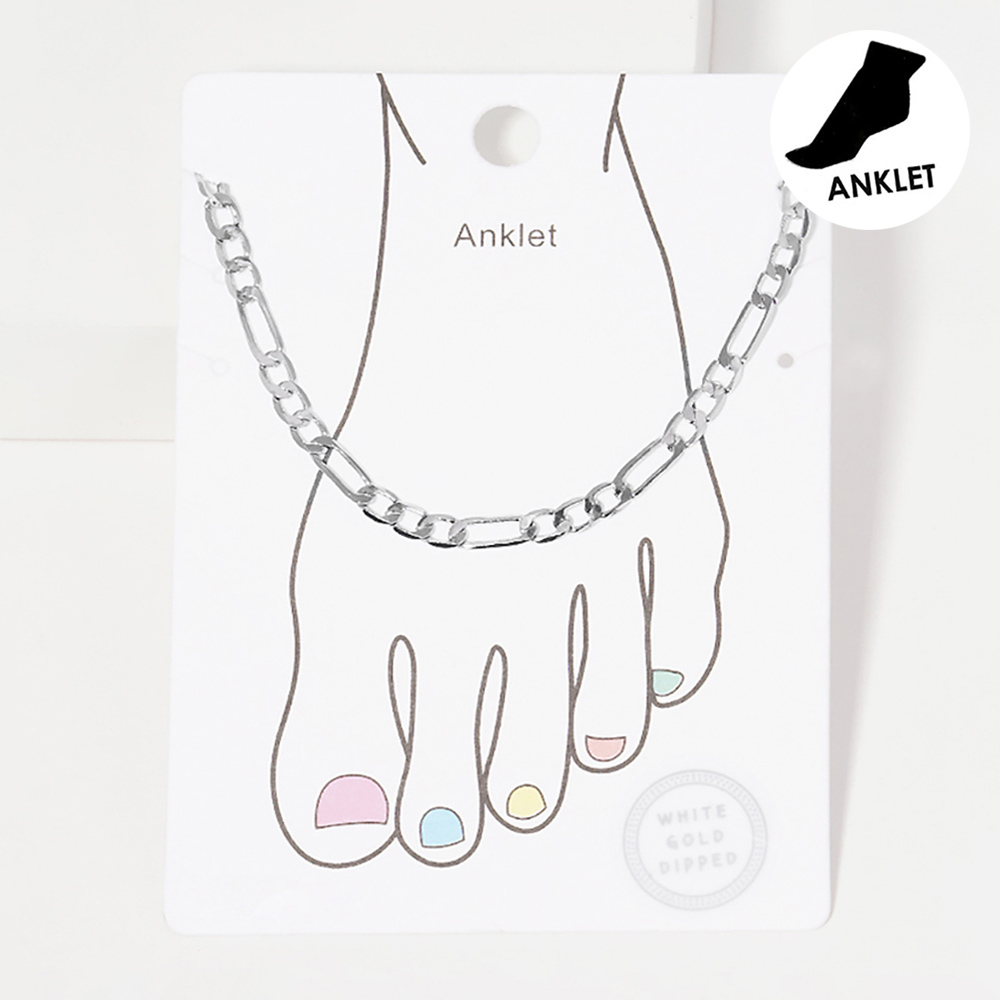 Details • Size : 0.2" H, 8.5" + 2" L • Lobster Clasp Closure • This white gold-dipped anklet features a classic Figaro chain design with alternating link sizes for timeless appeal. Hypoallergenic and sleek, it offers a comfortable fit and subtle shine—ideal for everyday wear or pairing with other anklets for a layered, on-trend look. • Lead and Nickel Compliant • Hypoallergenic • Made In Korea • Gold Dipped