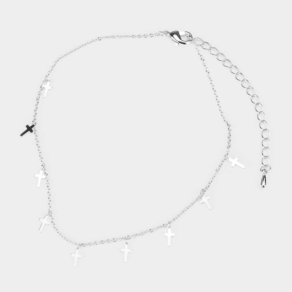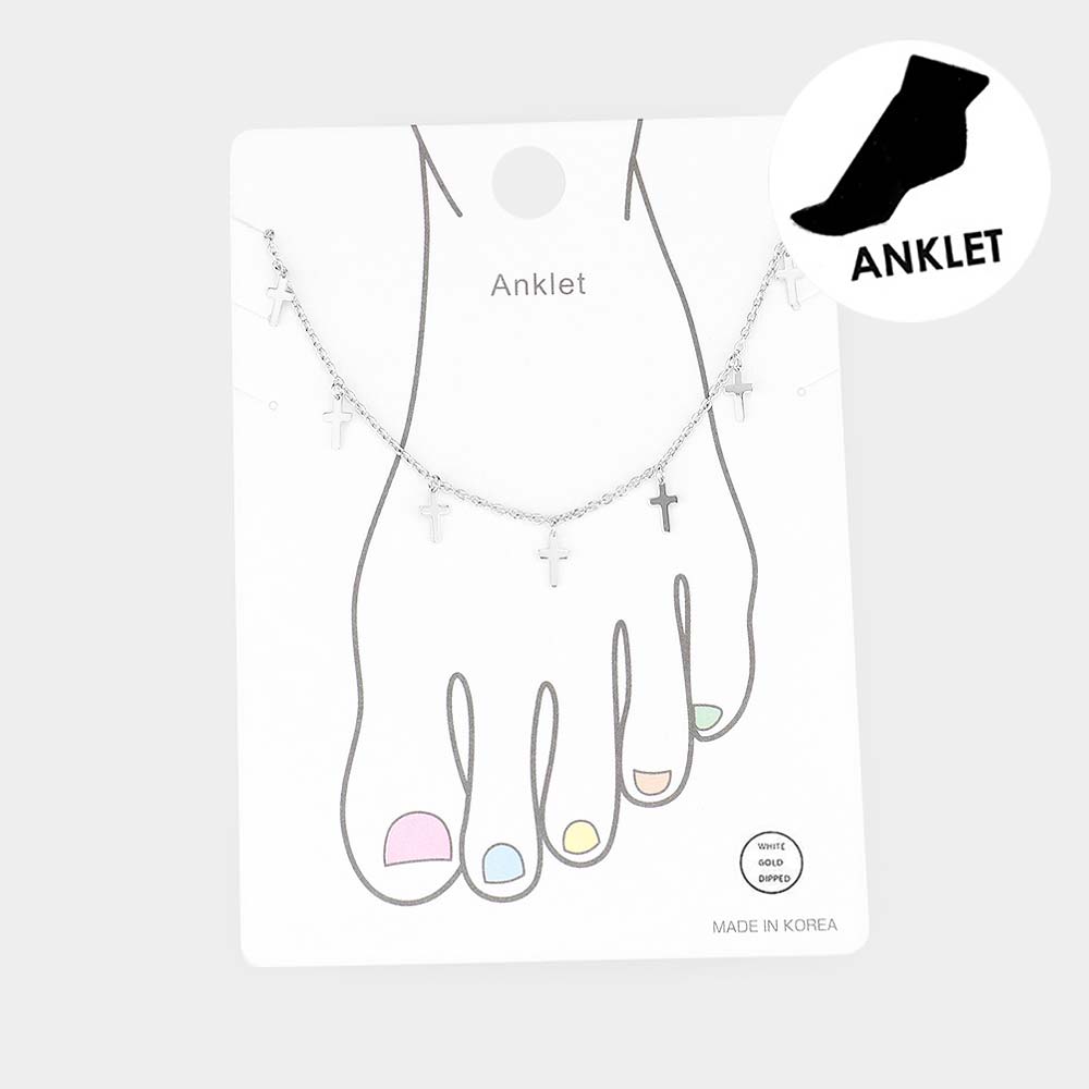 White Gold Dipped Metal Cross Station Anklet